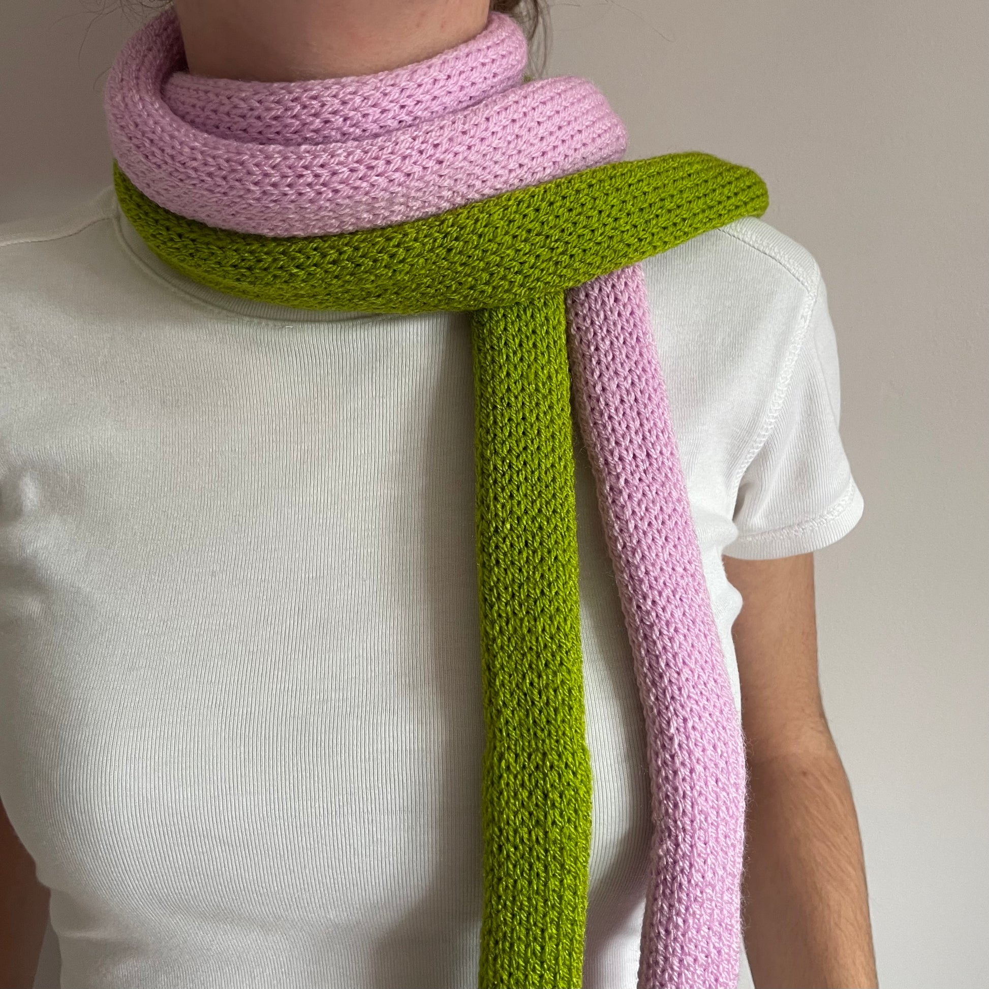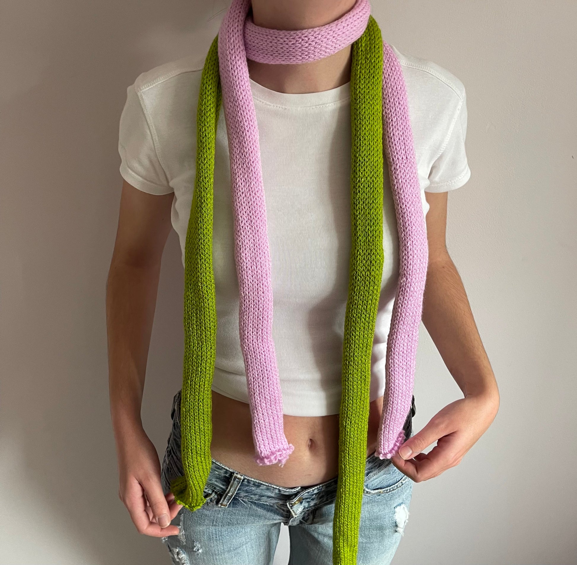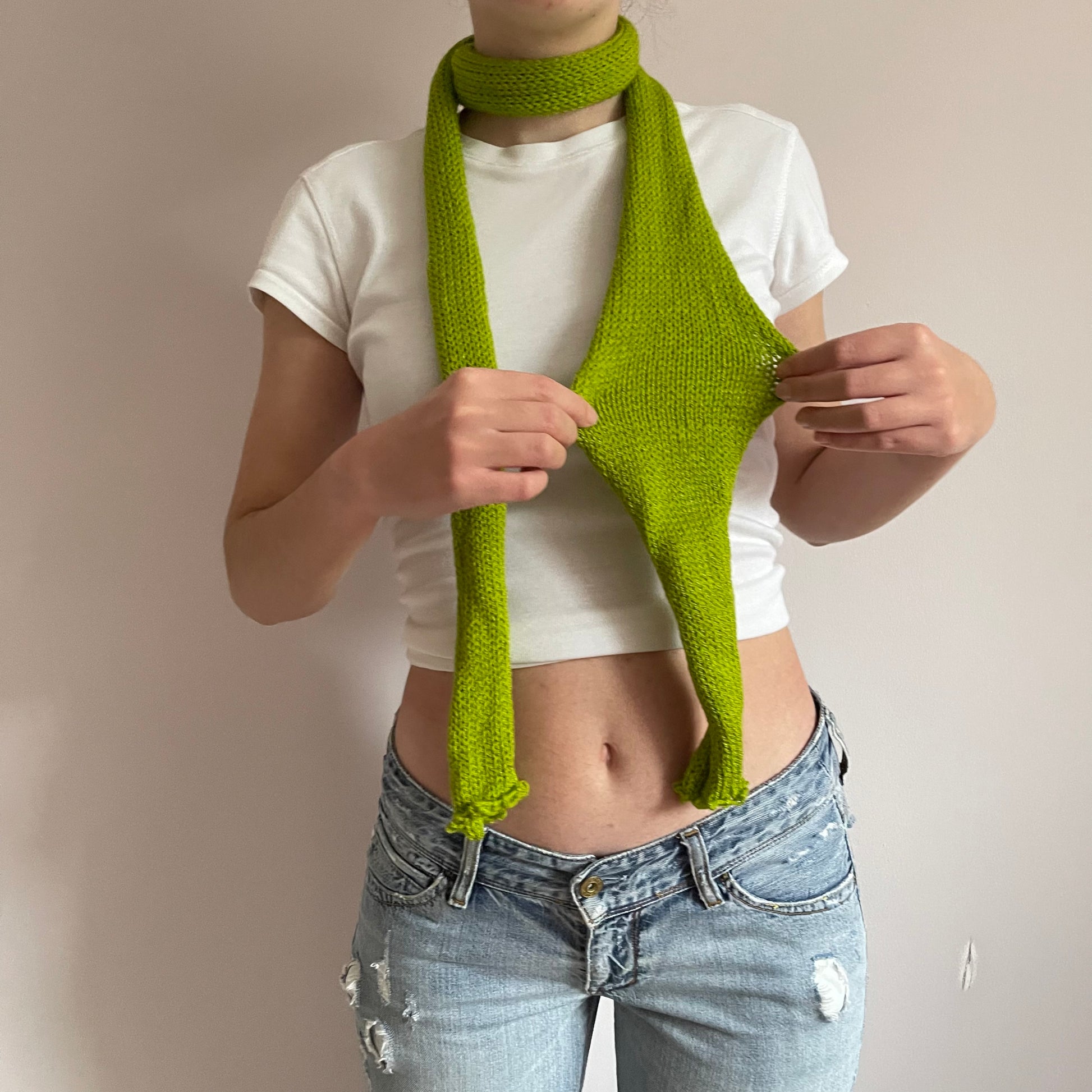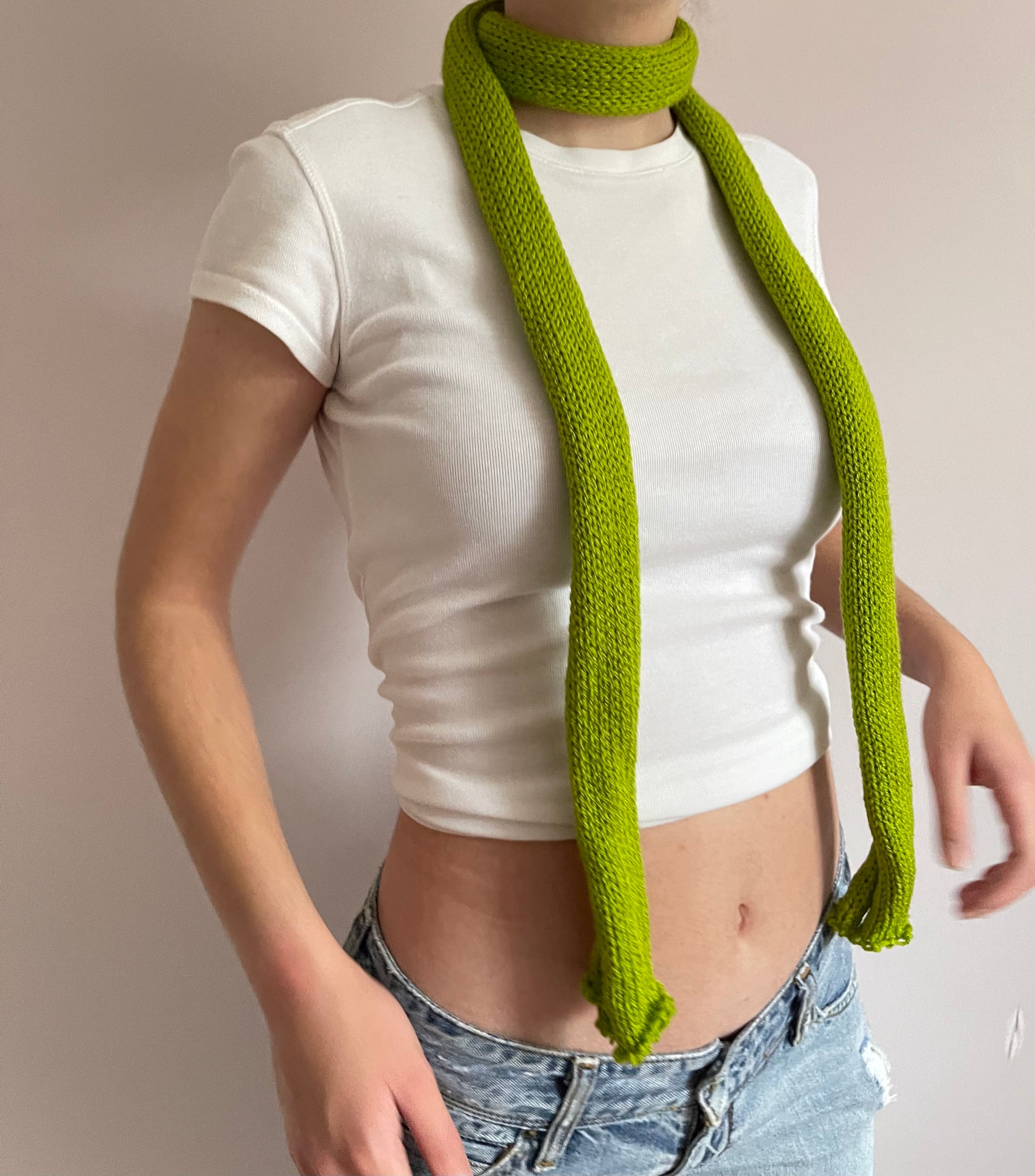 Knit skinny scarf in olive green, the perfect addition to your outfit and really flattering. Great for all year round! 🫒
