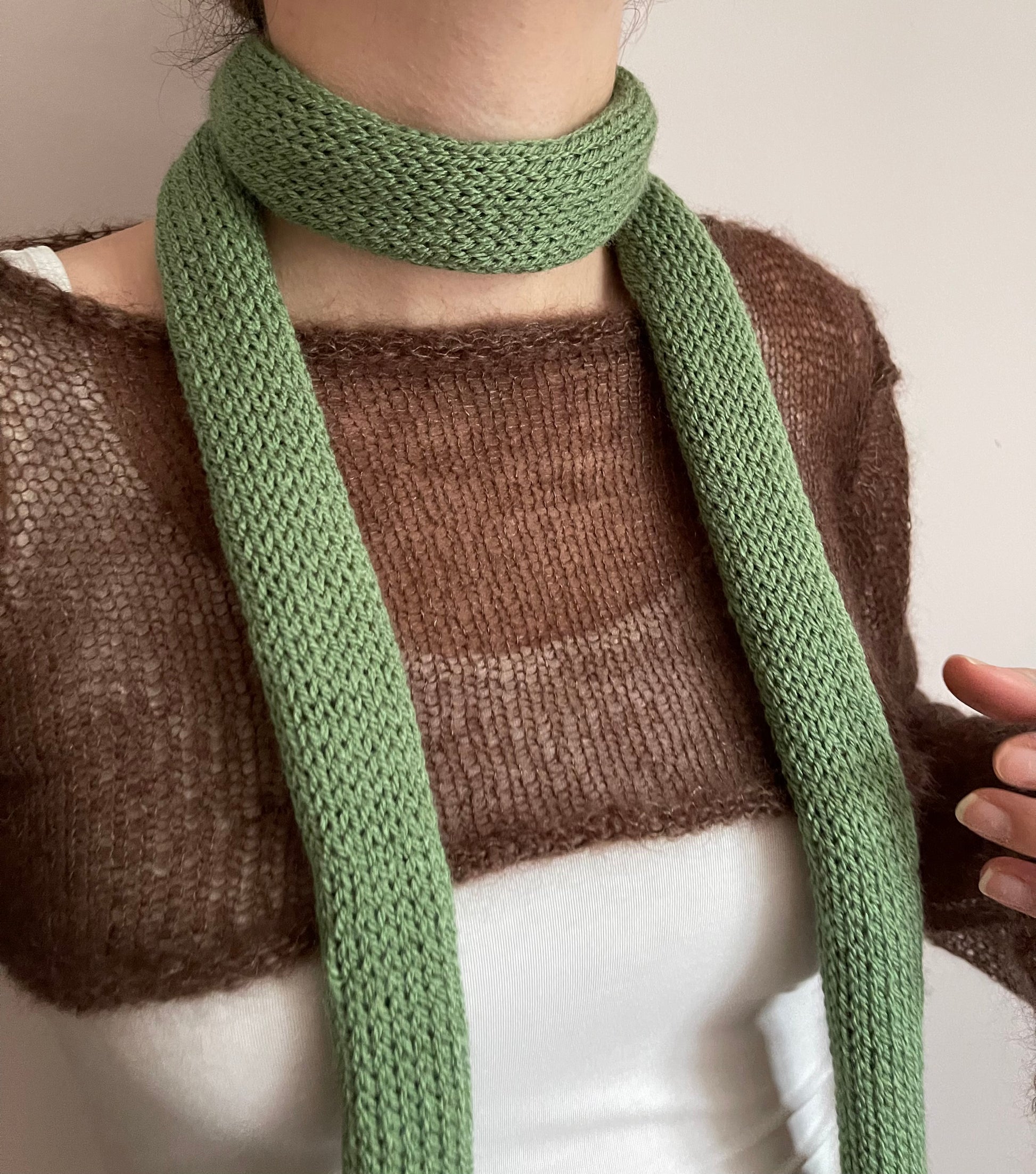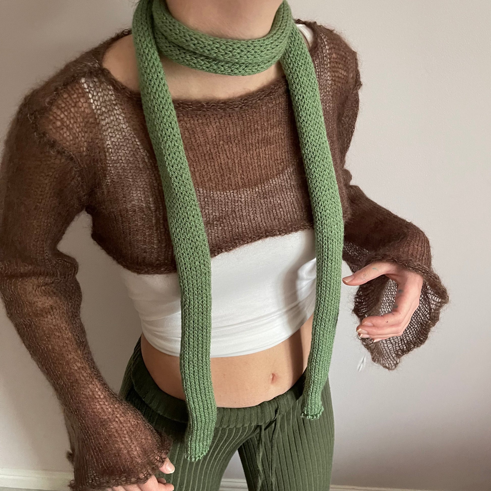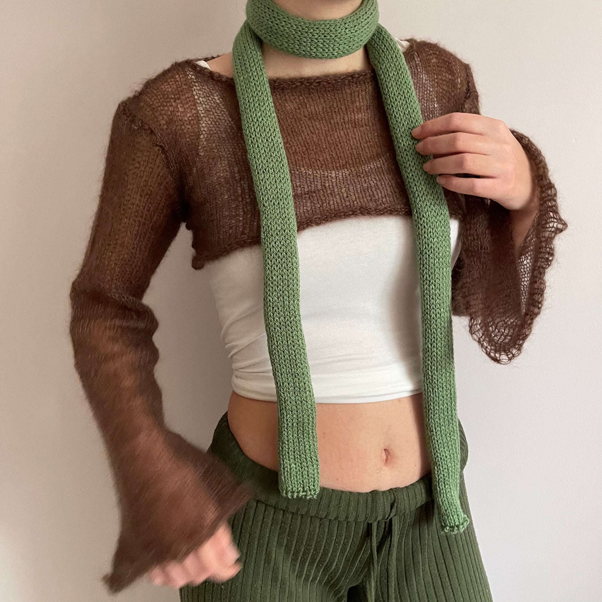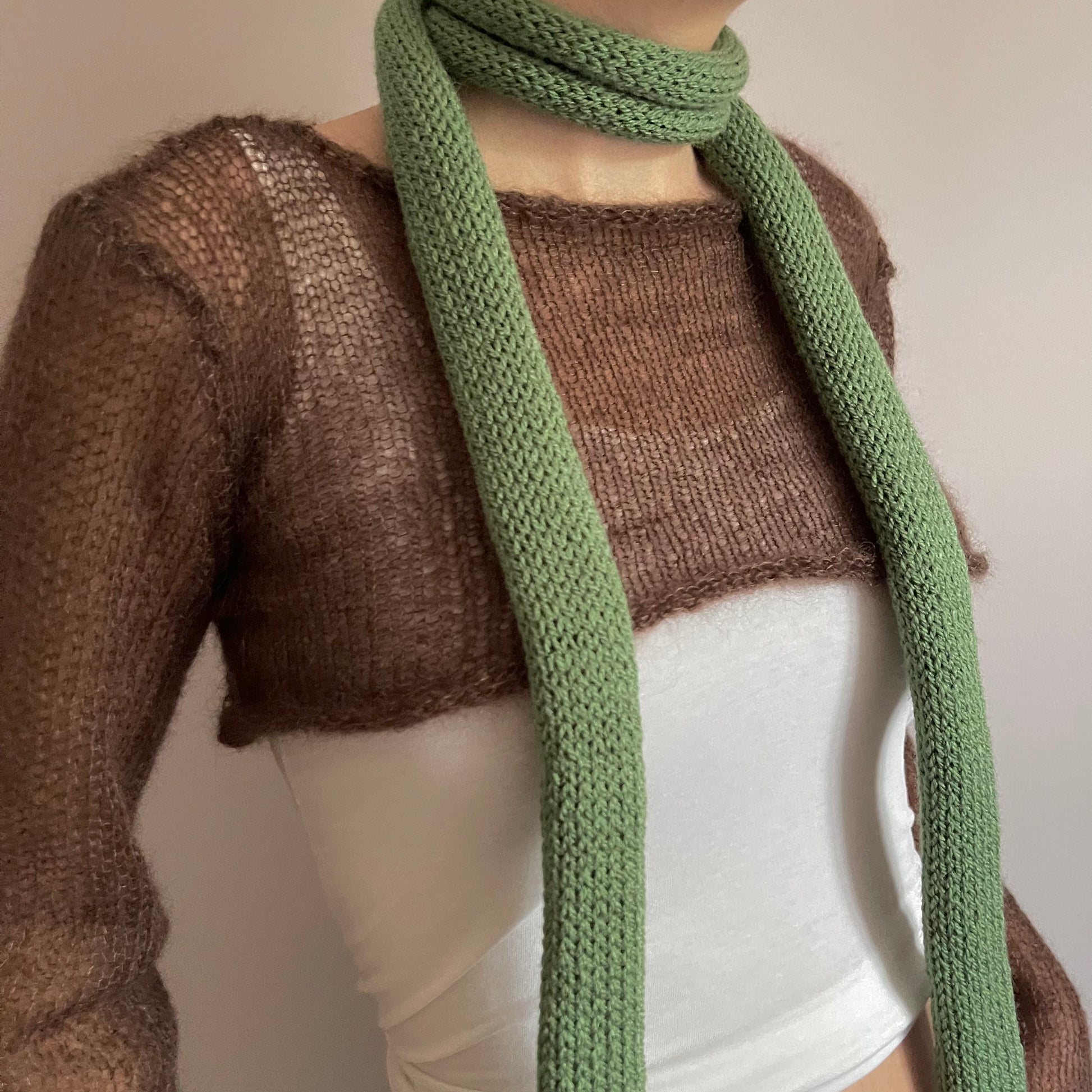 Knit skinny scarf in sage green - the perfect addition to your outfit. Great for all year round! 🧚🏼