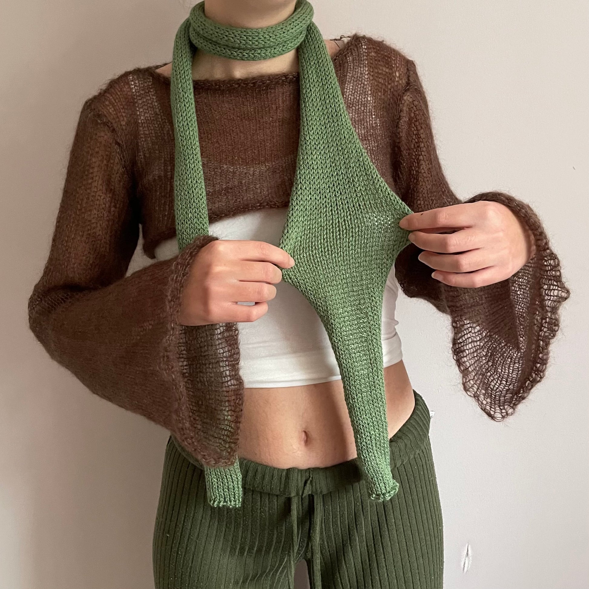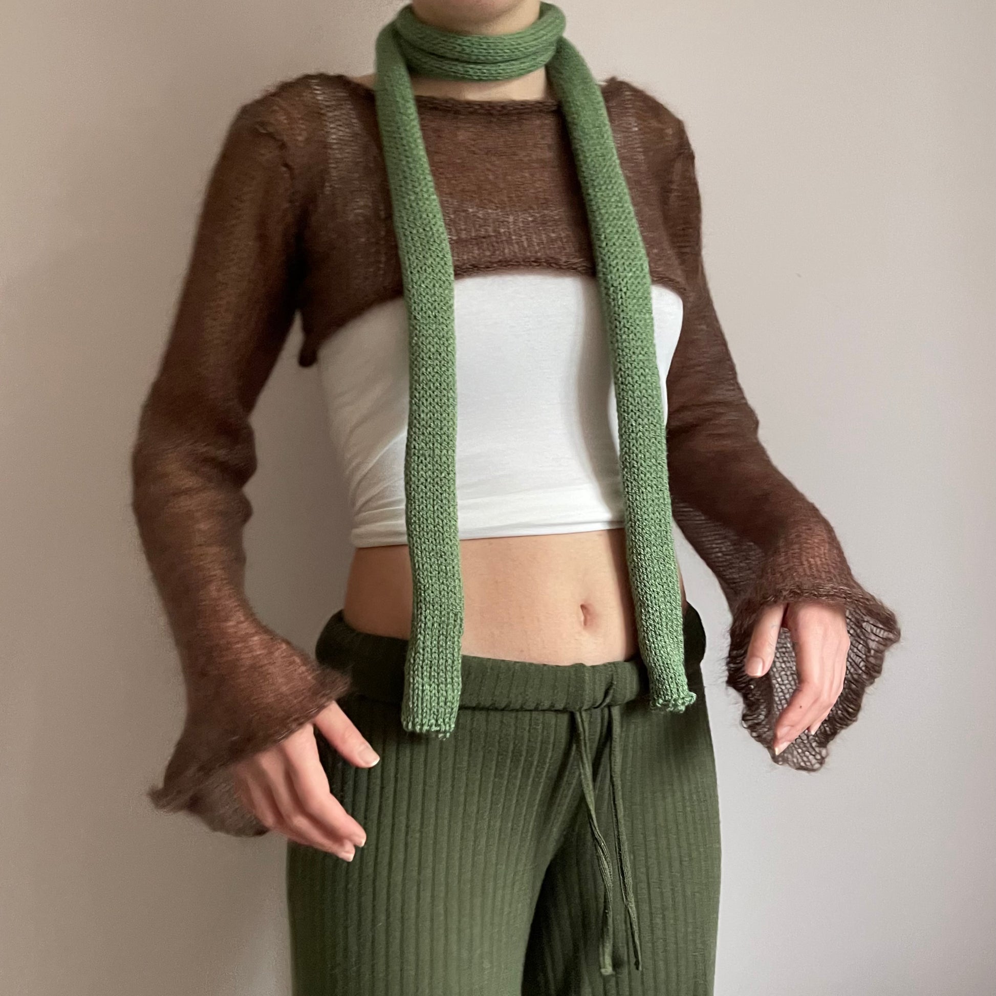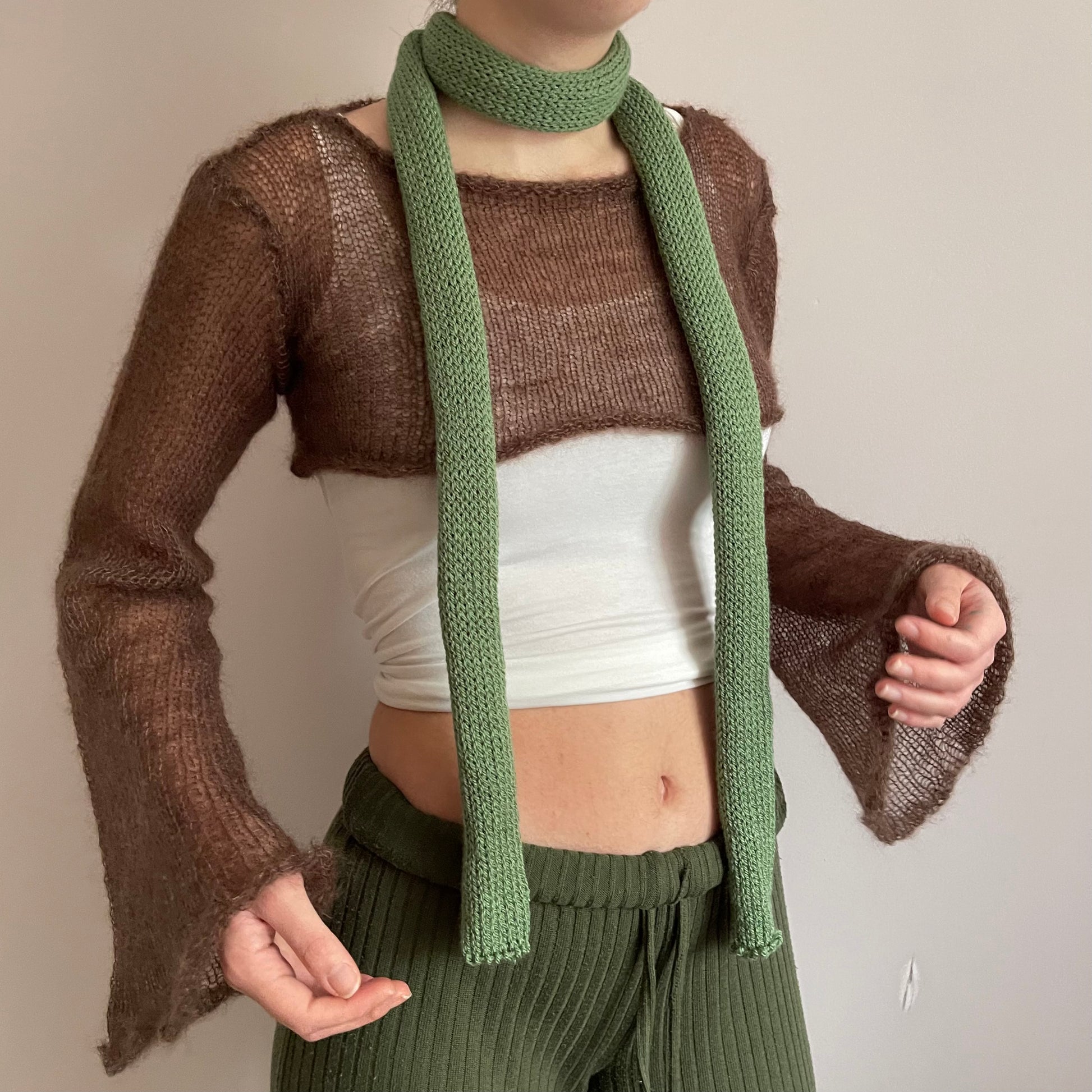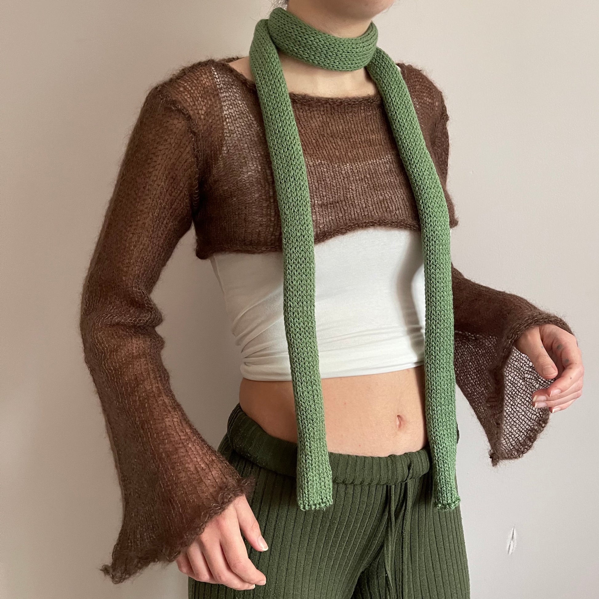 Knit skinny scarf in sage green - the perfect addition to your outfit. Great for all year round! 🧚🏼