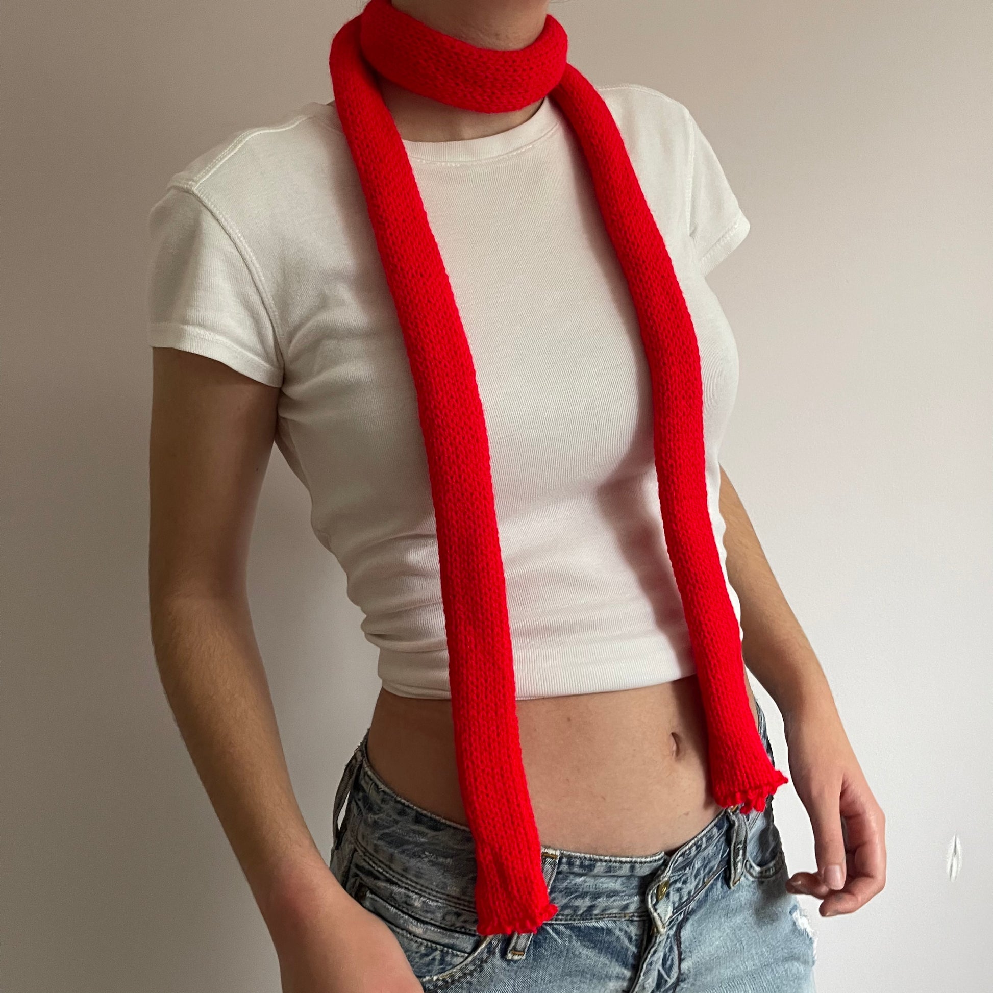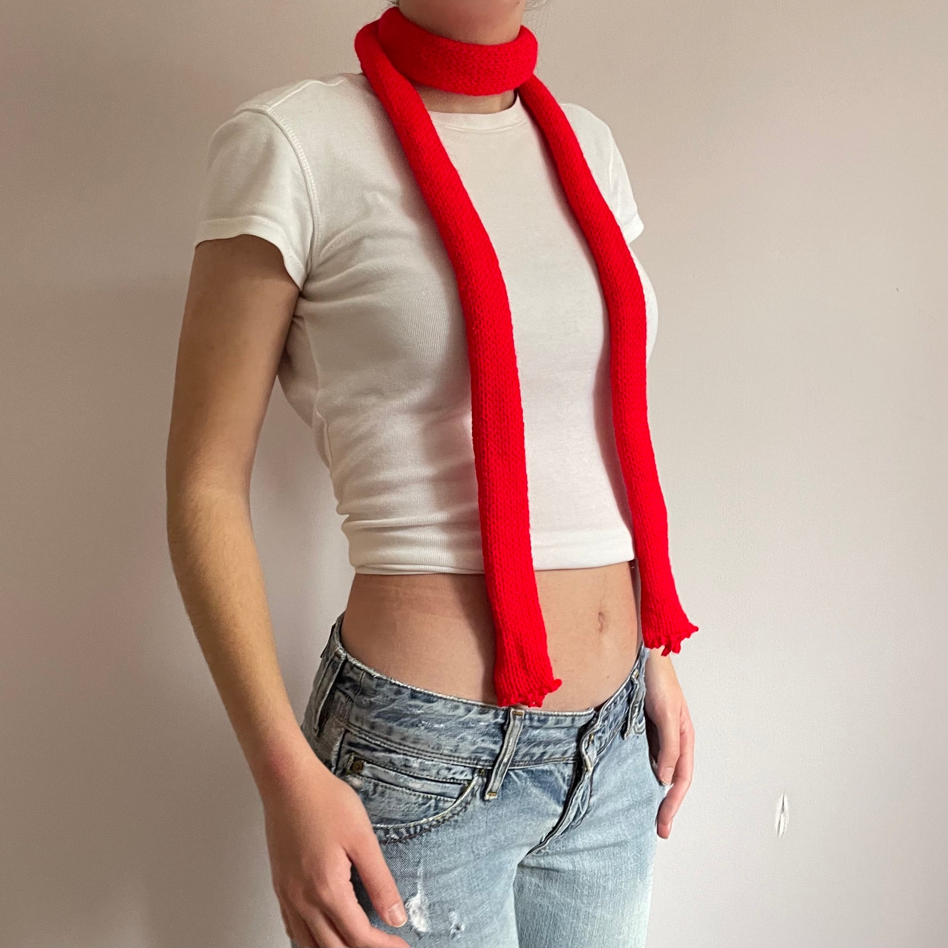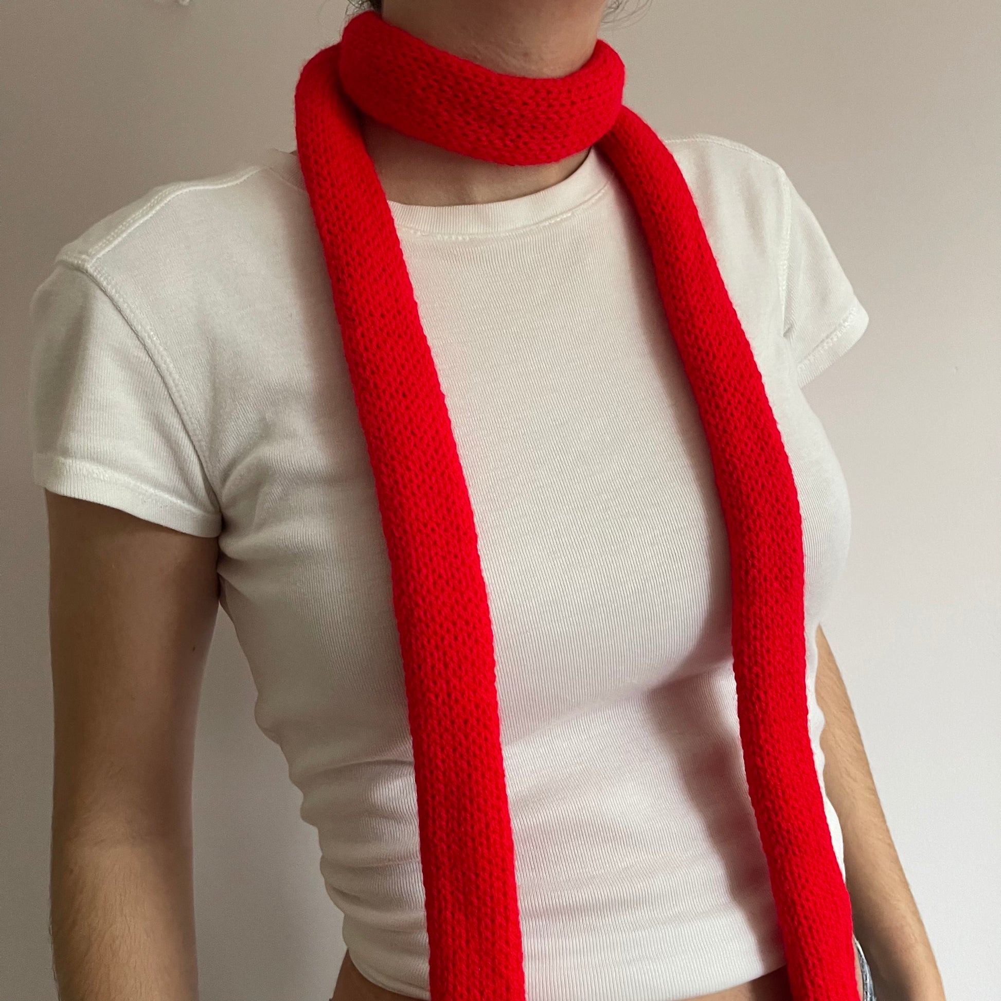 Knit red skinny scarf, the perfect addition to your outfit and really flattering. Great for all year round! โค๏ธ๐งฃ