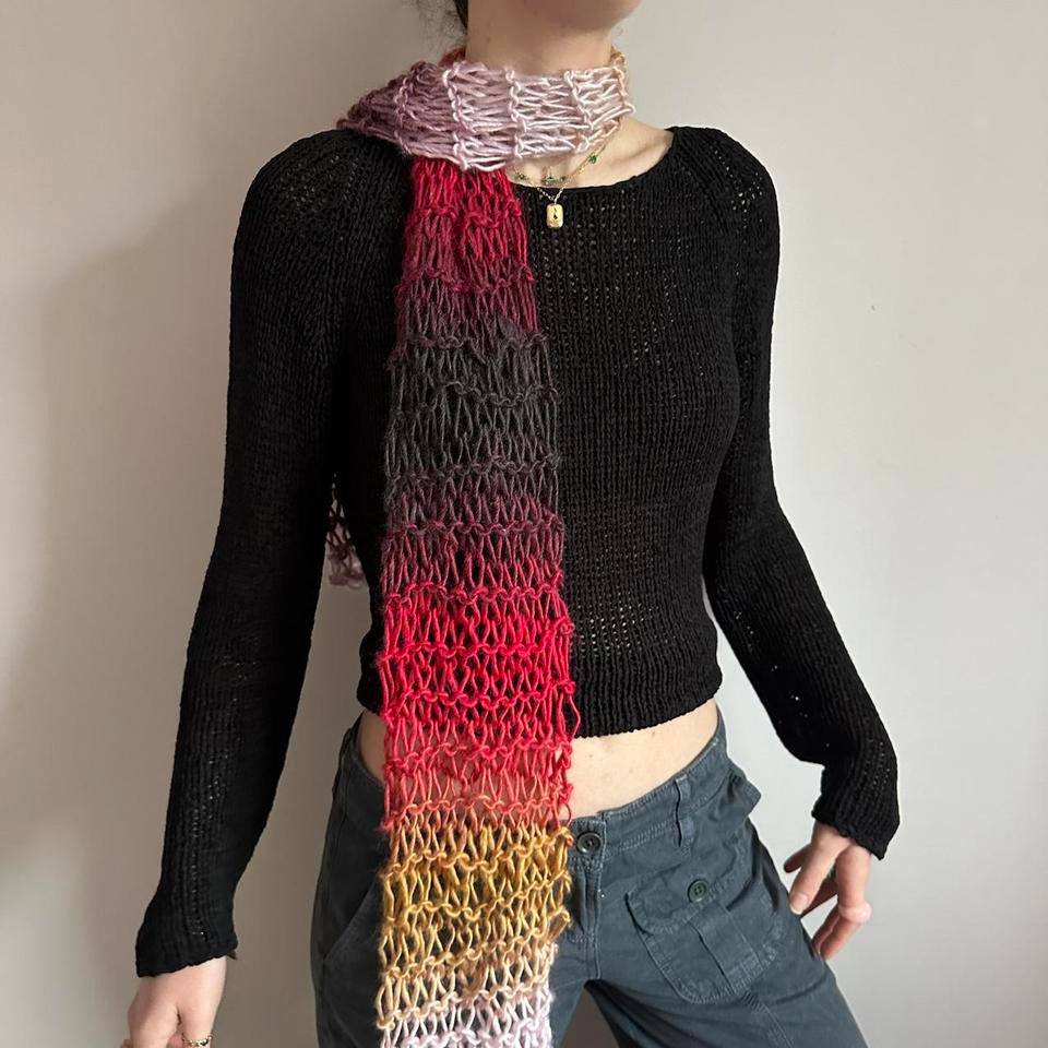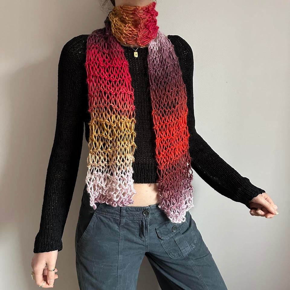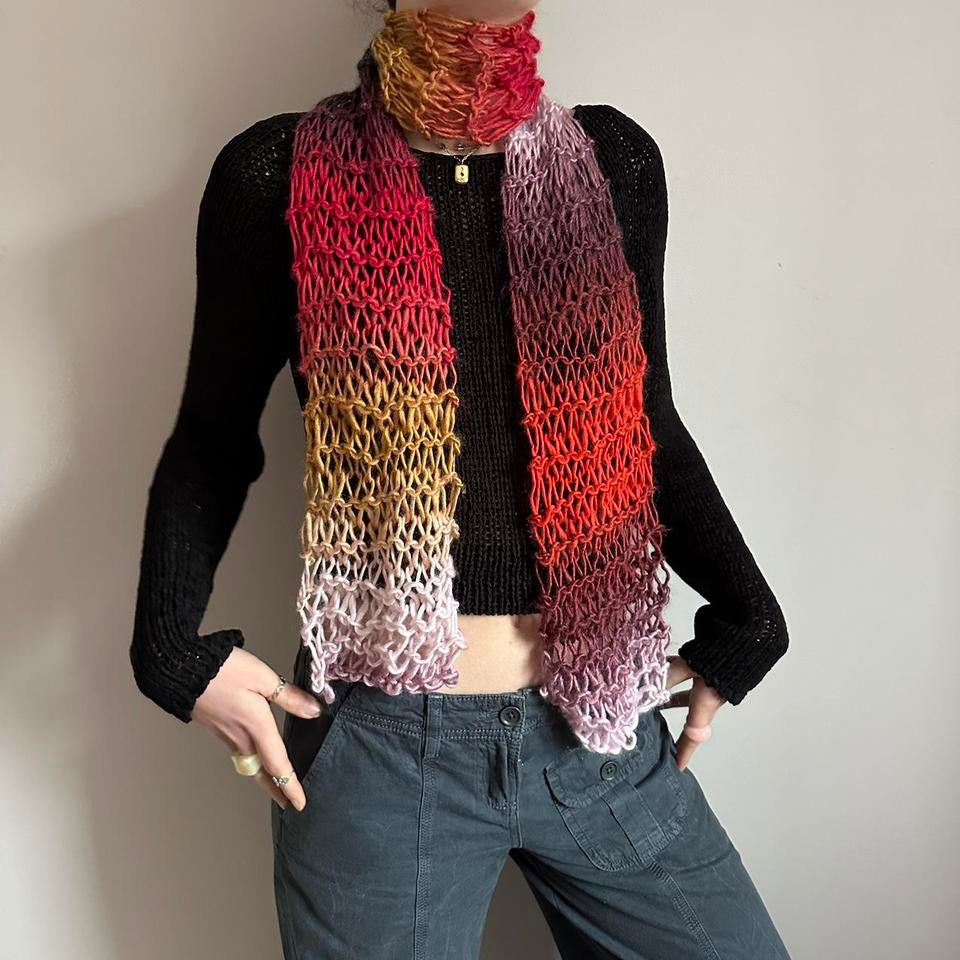 The cutest handmade fishnet / distressed knit scarf in red, yellow, orange, black, purple and pink ombré 🧶