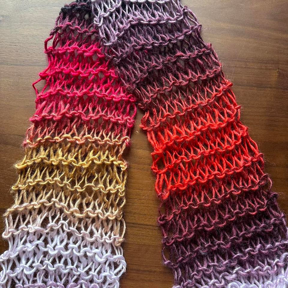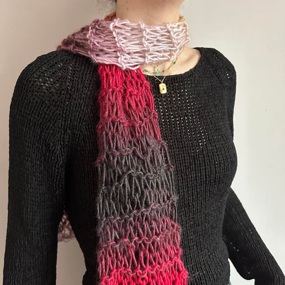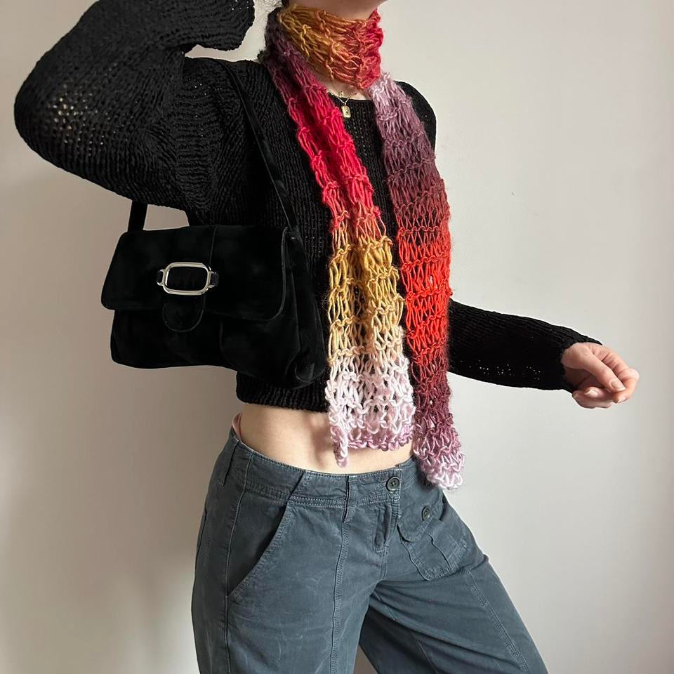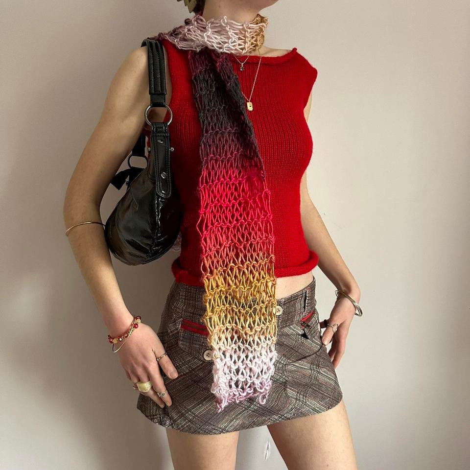 The cutest handmade fishnet / distressed knit scarf in red, yellow, orange, black, purple and pink ombré 🧶