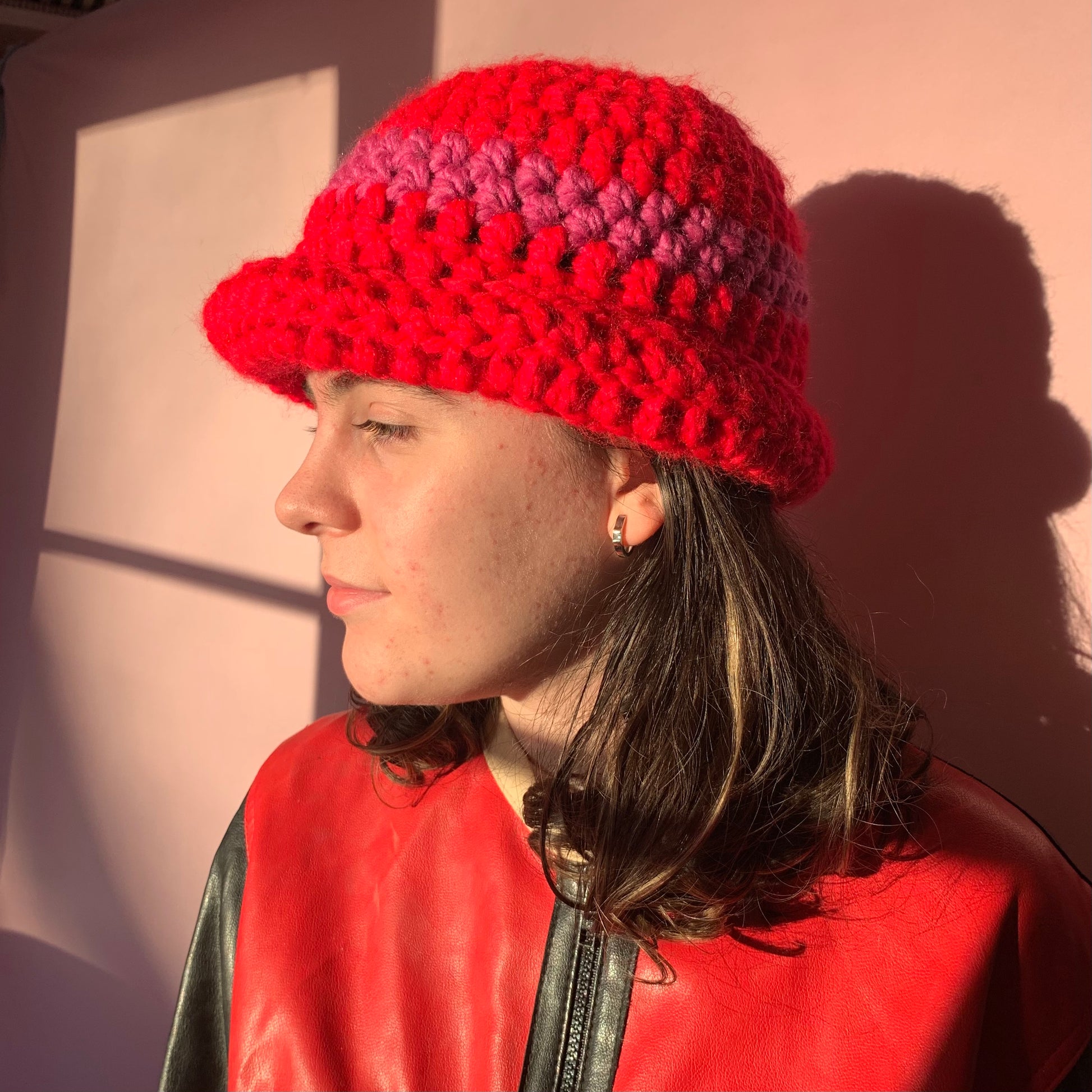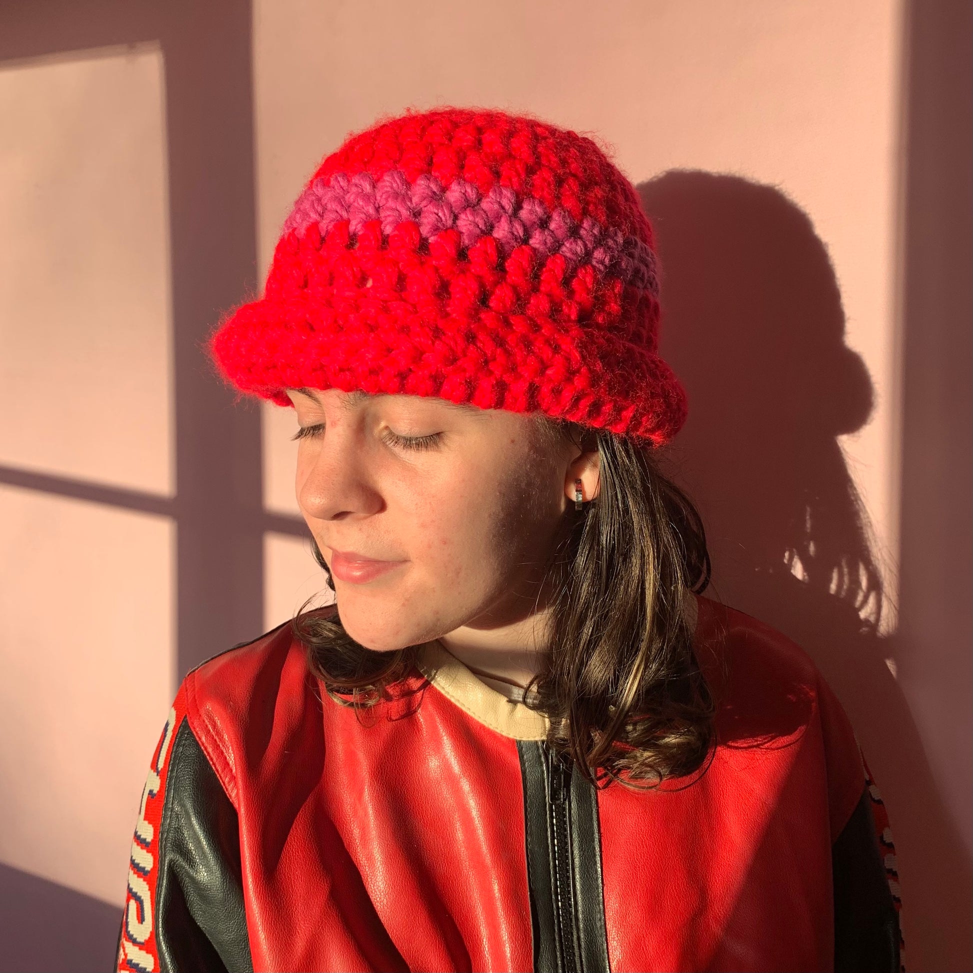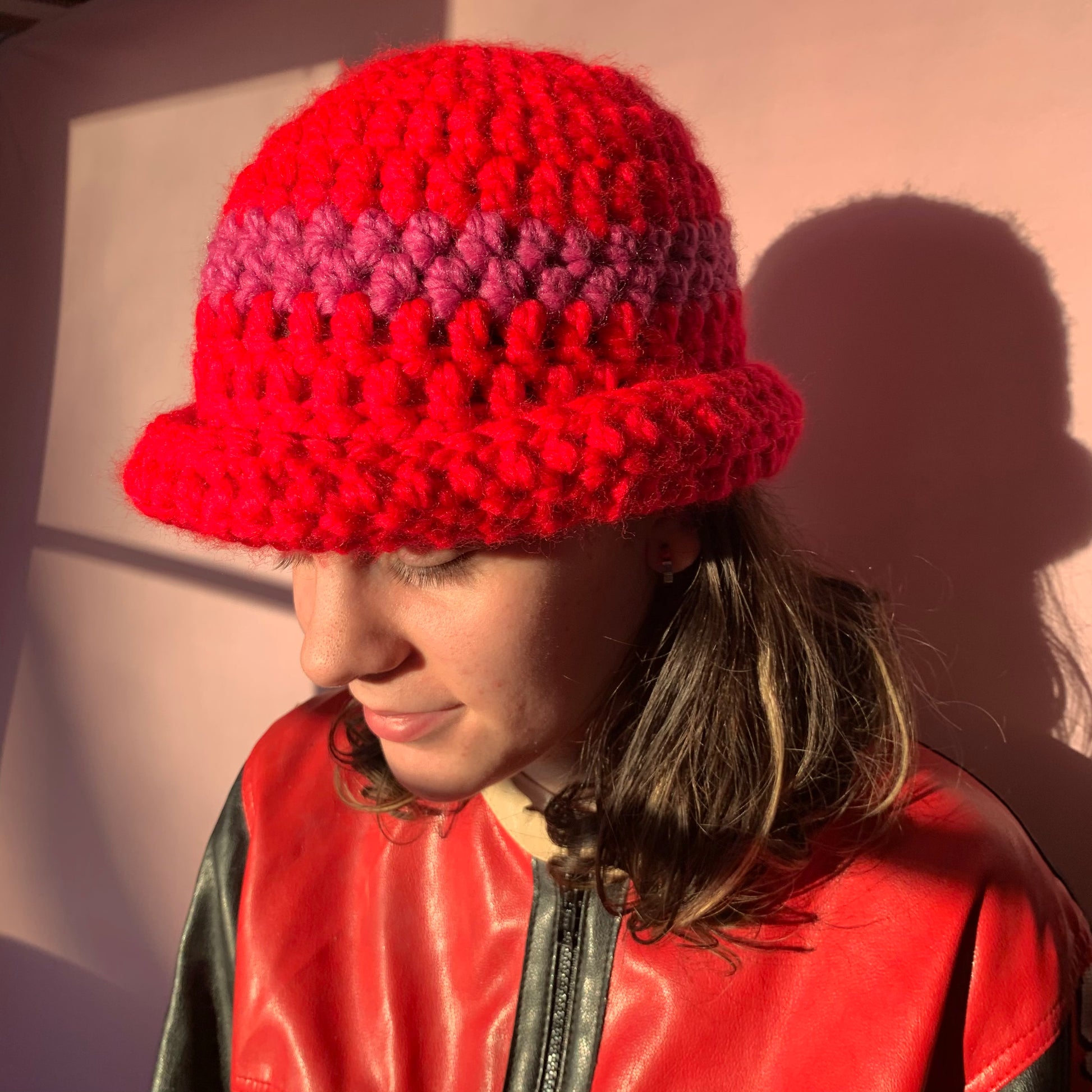 Handmade scarlet red chunky crochet bowler hat with fuschia pink stripe