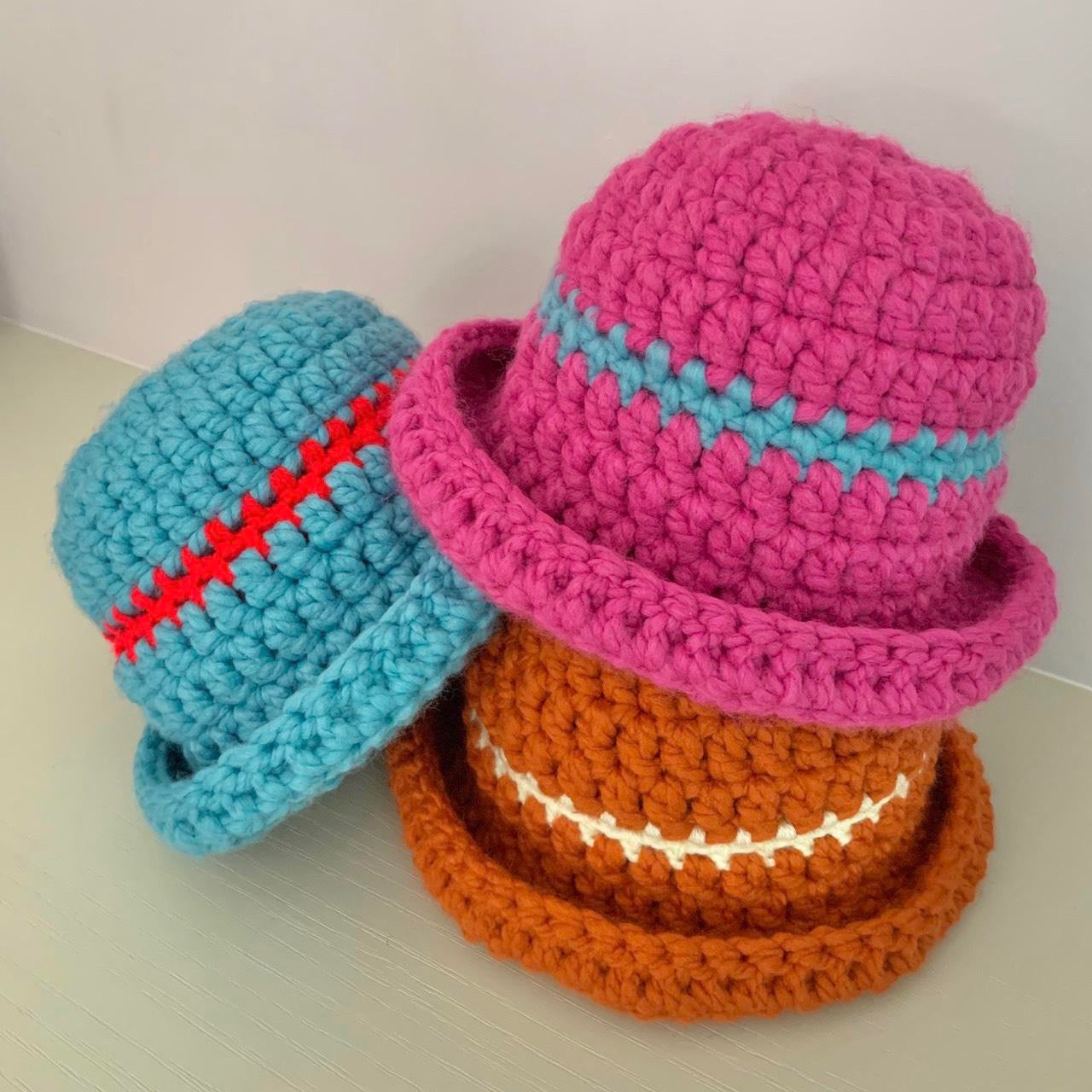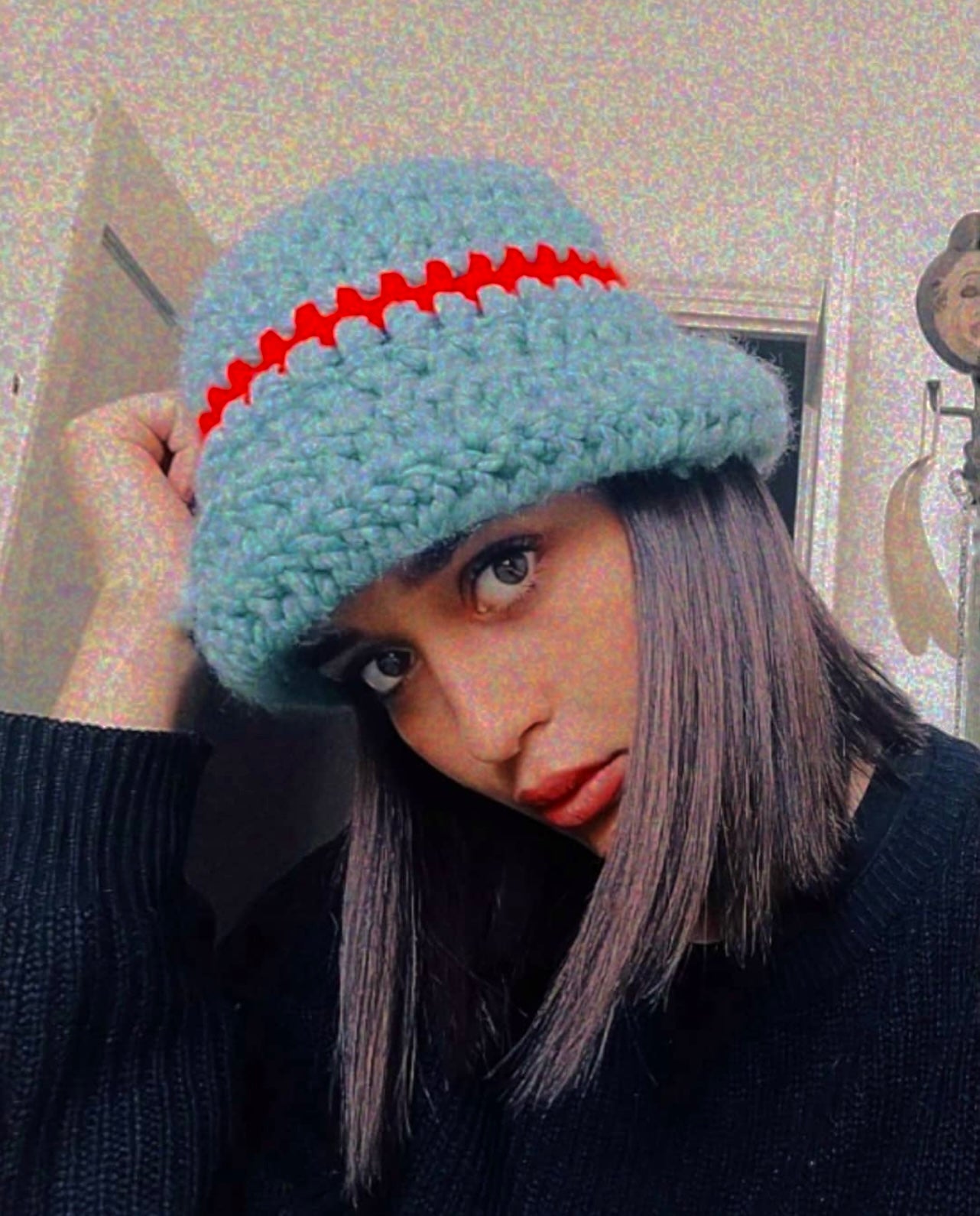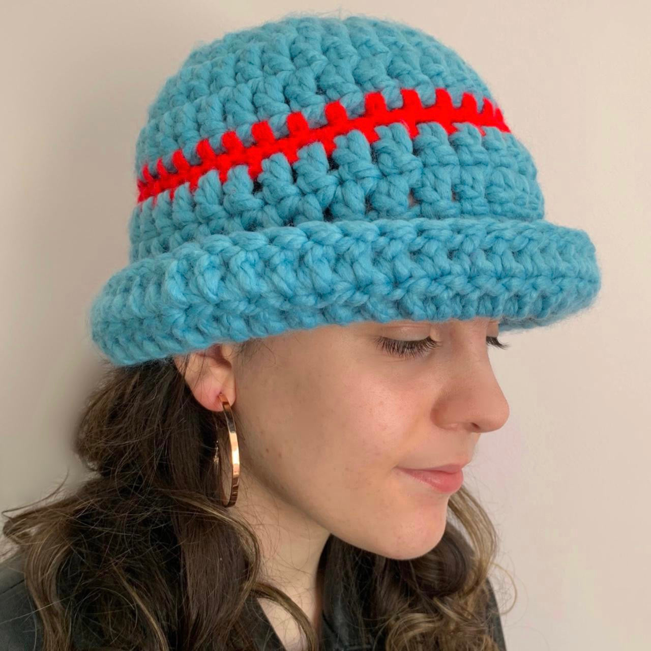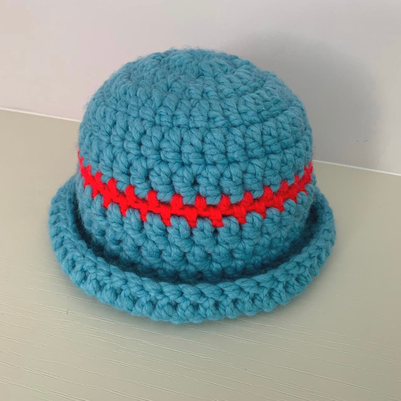 Handmade sea blue chunky crochet bowler hat with red stripe