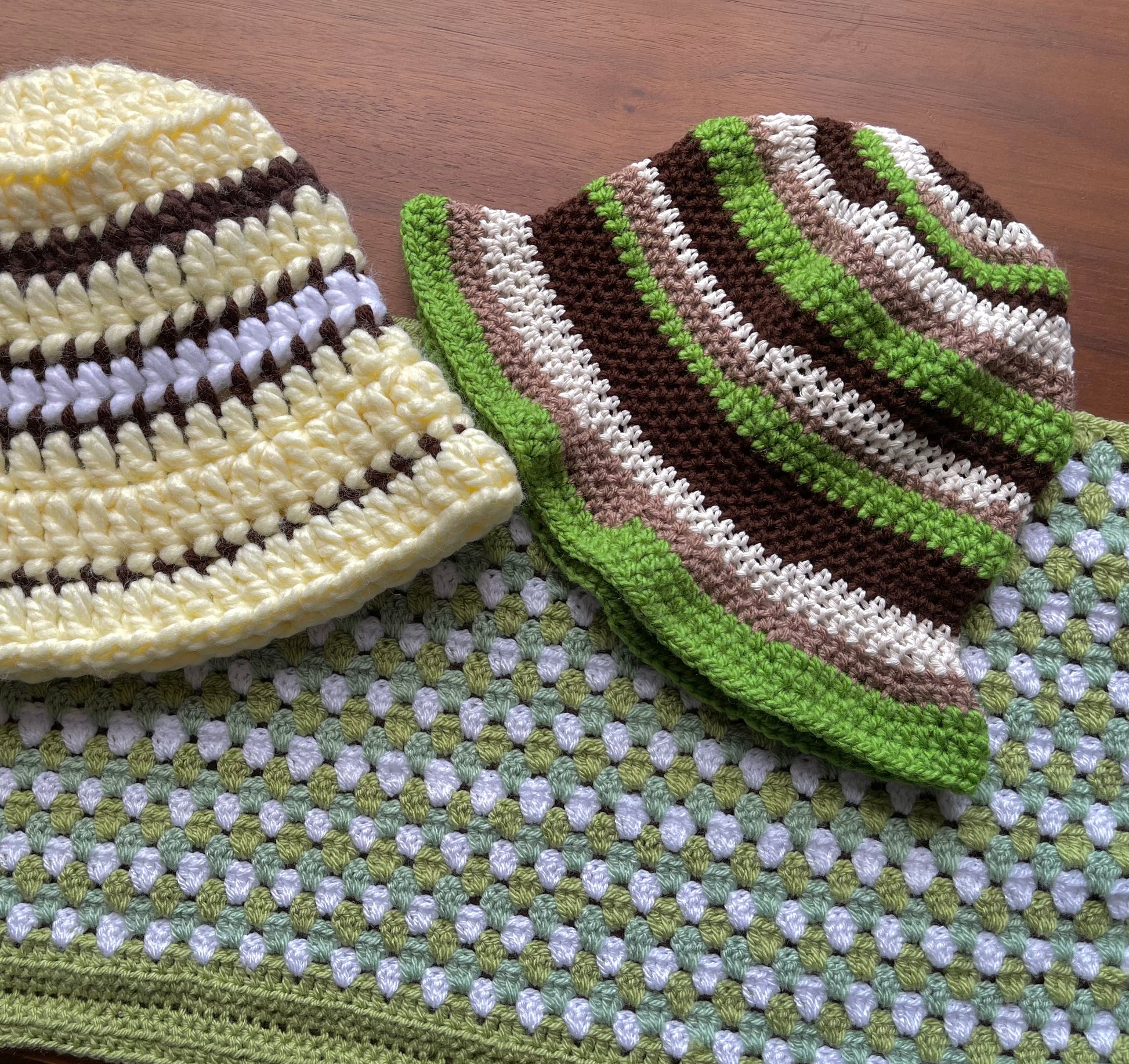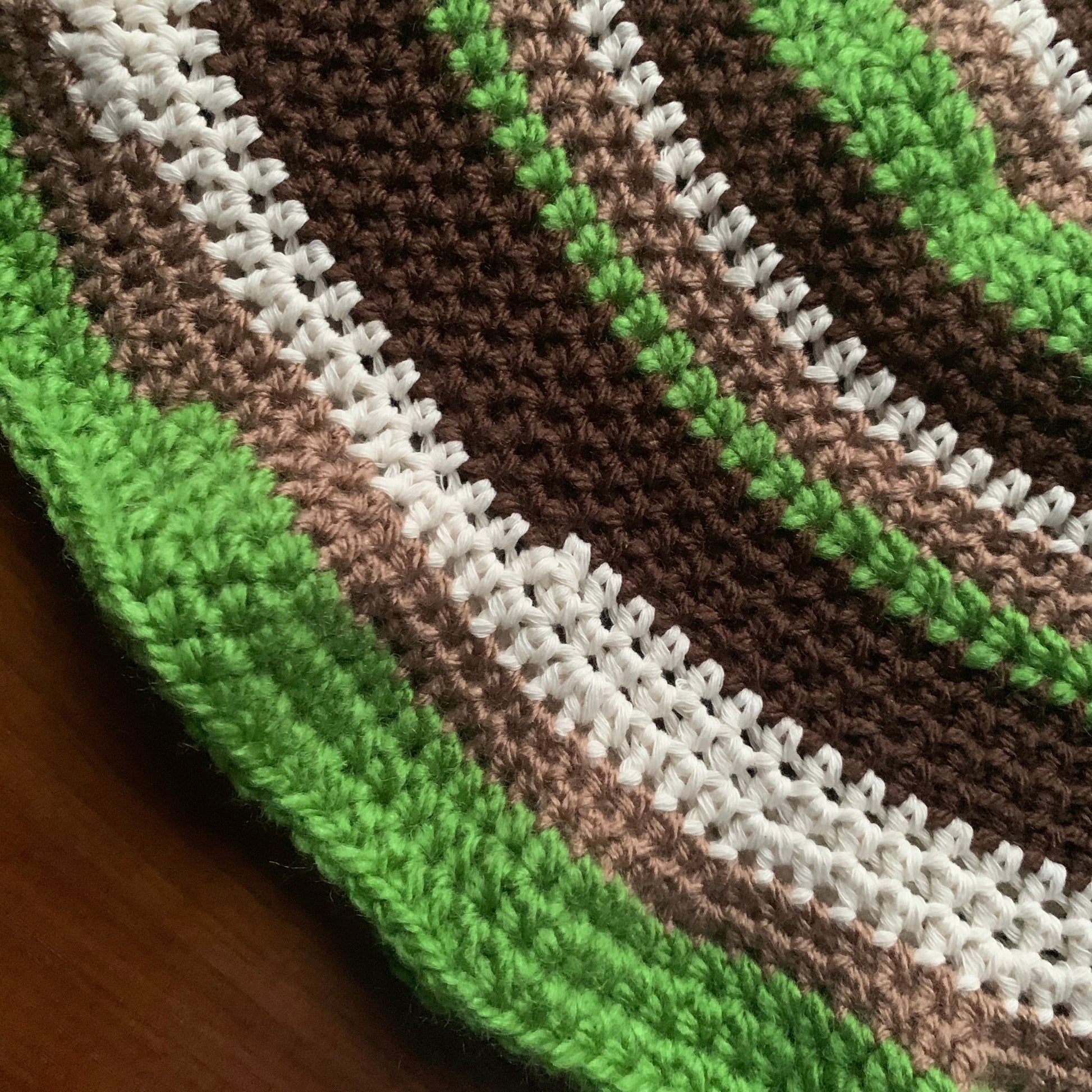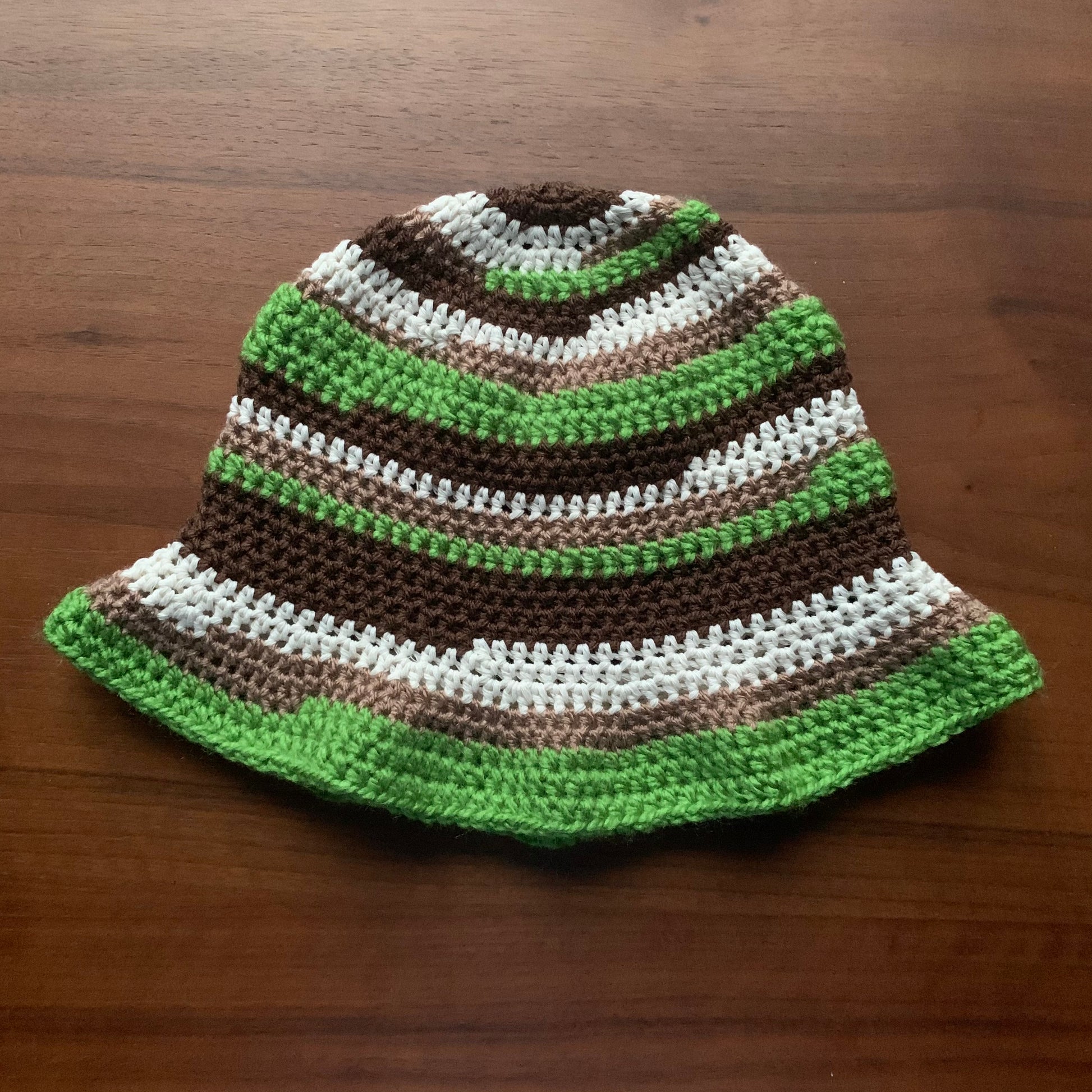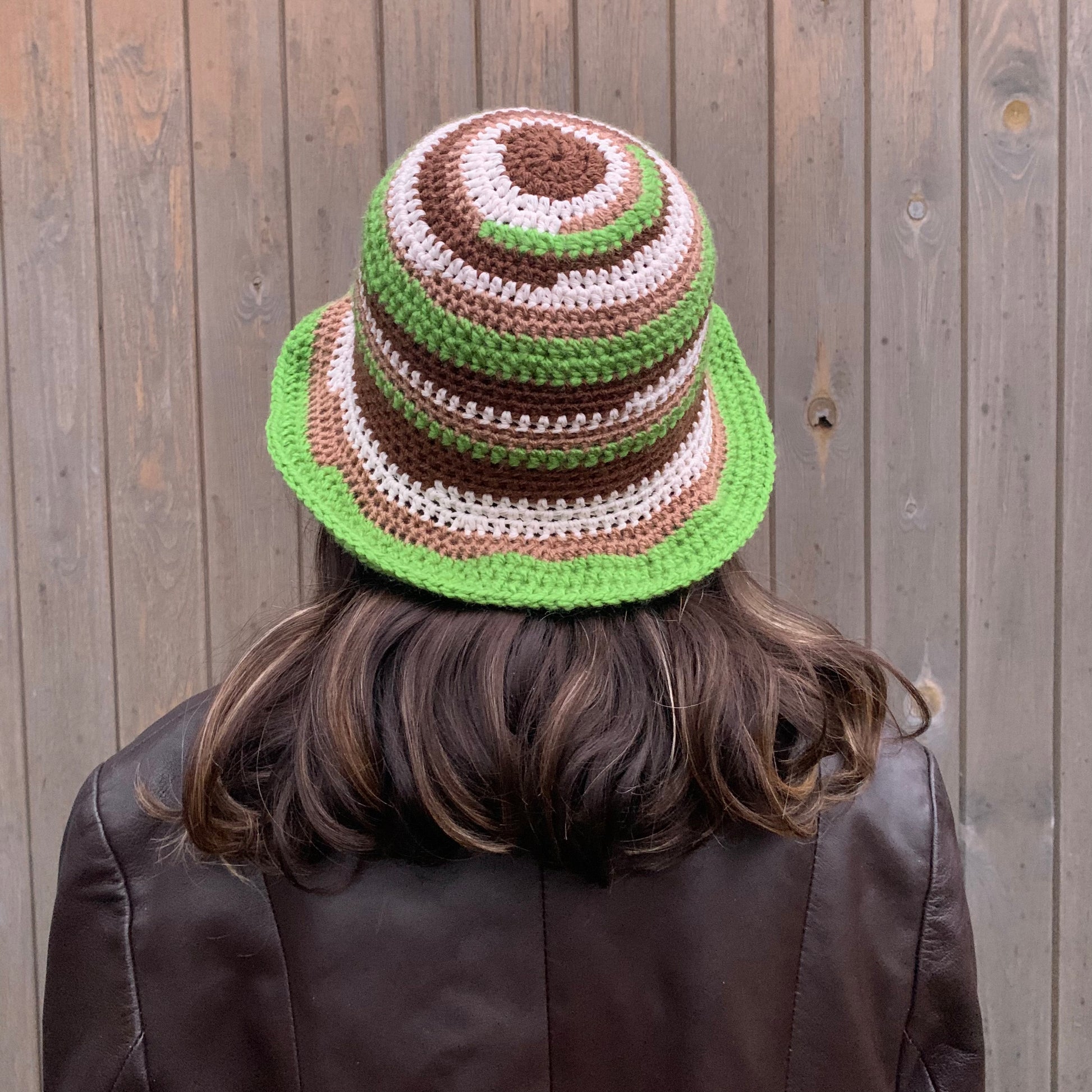 HANDMADE TO ORDER uneven striped crochet bucket in green, brown and off white with flowy brim 🤎🍃🐌🧚🏼