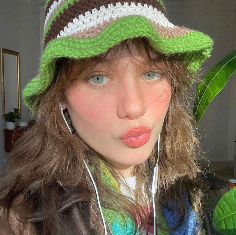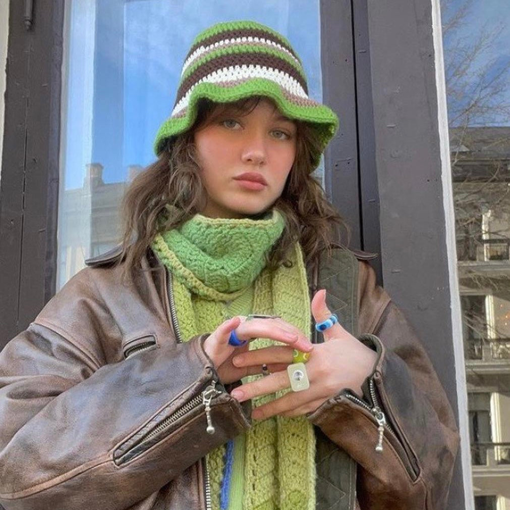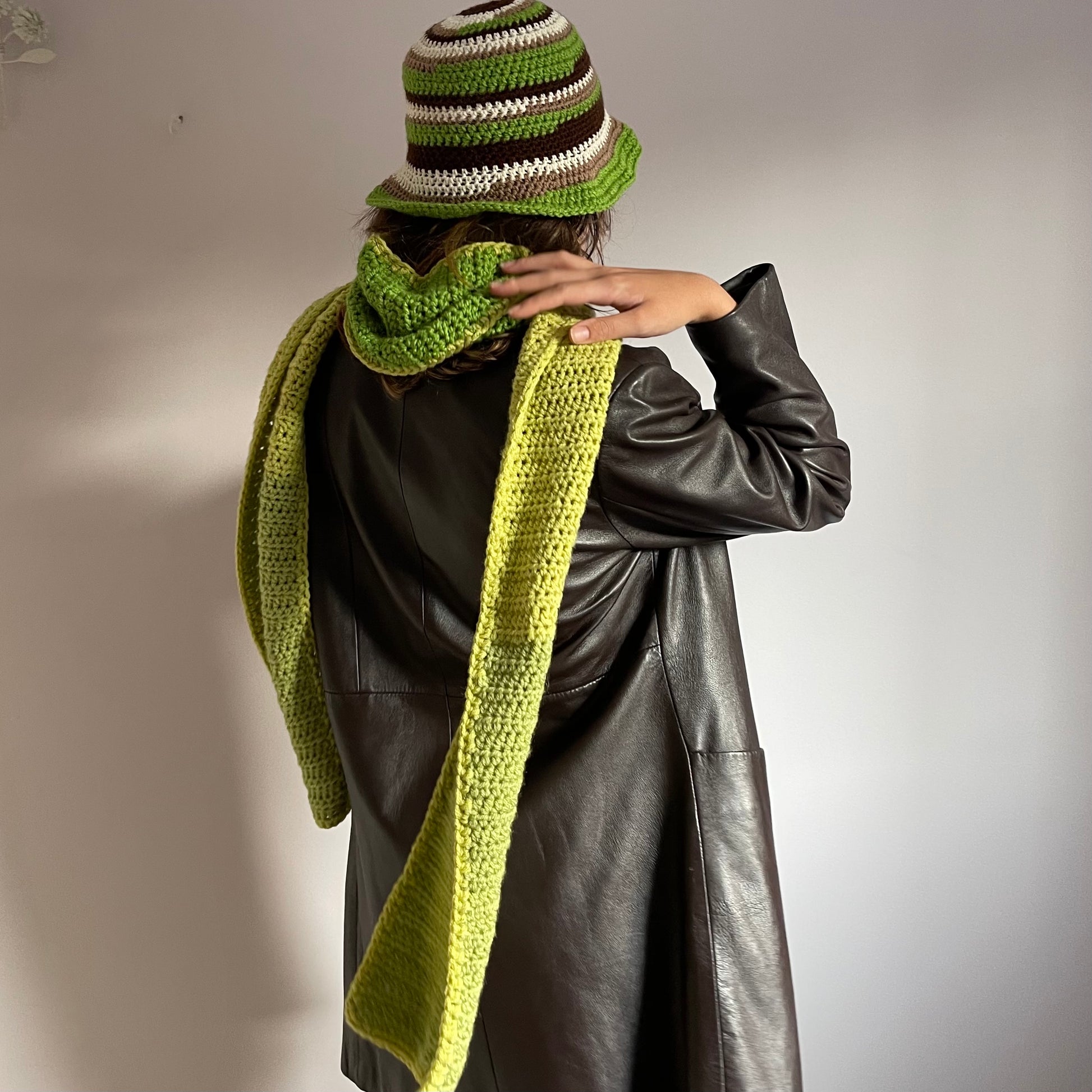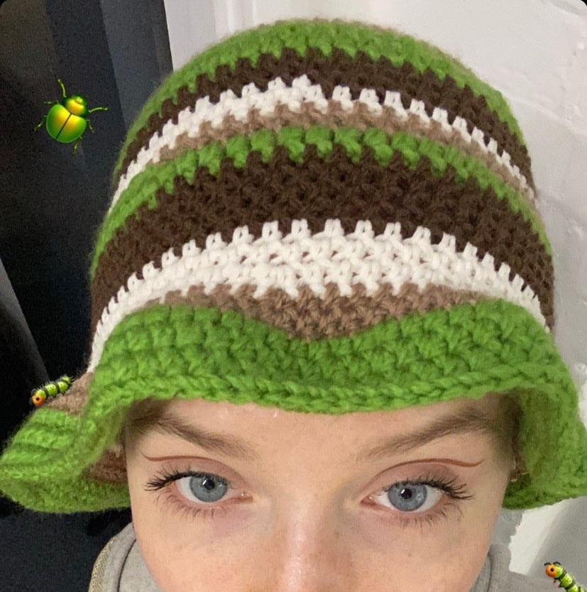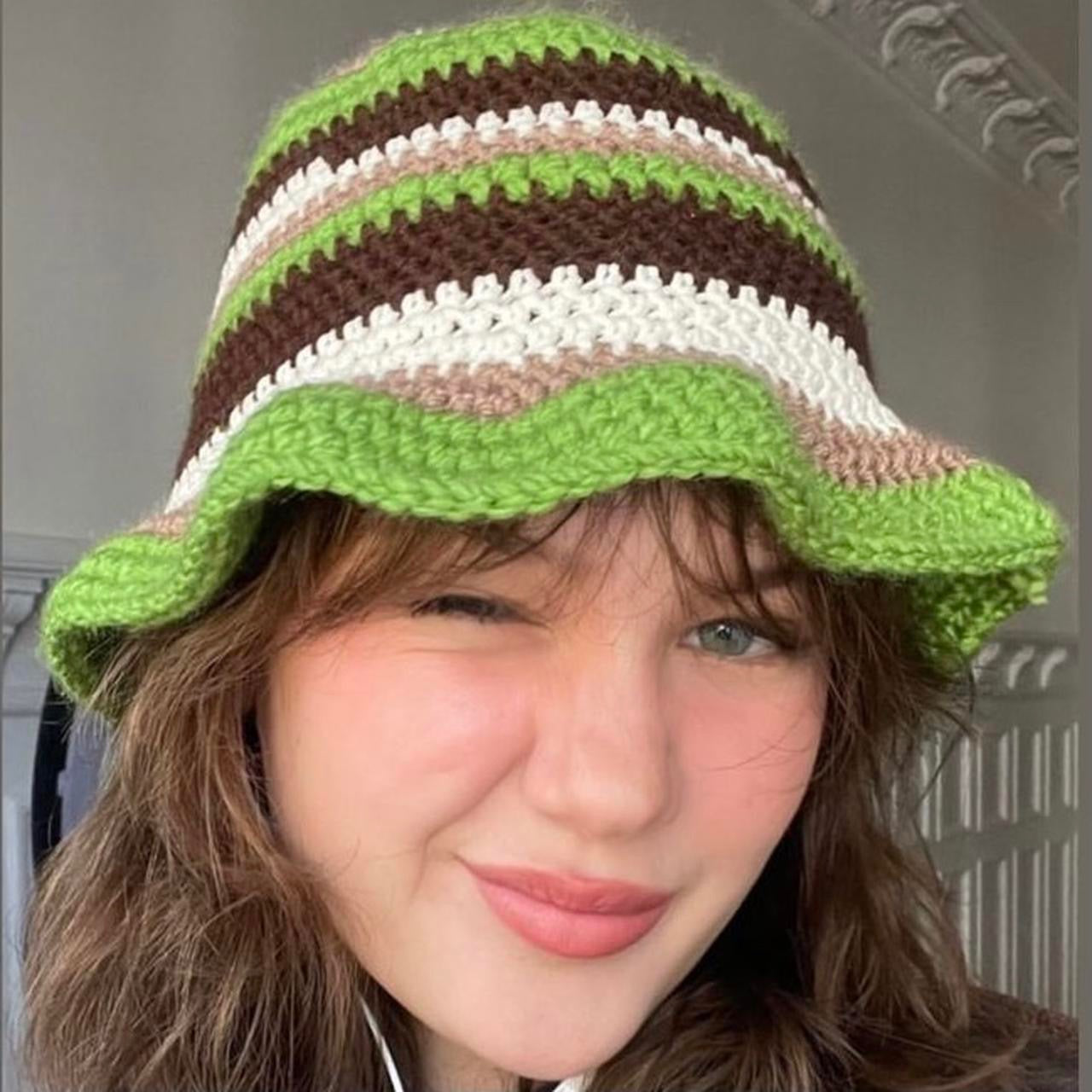 HANDMADE TO ORDER uneven striped crochet bucket in green, brown and off white with flowy brim 🤎🍃🐌🧚🏼