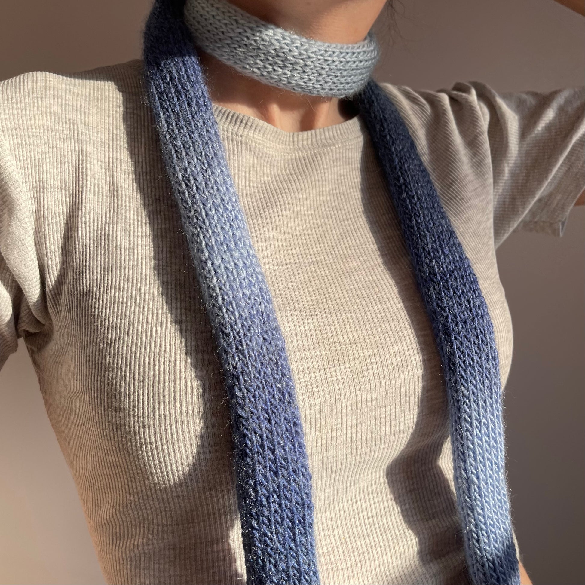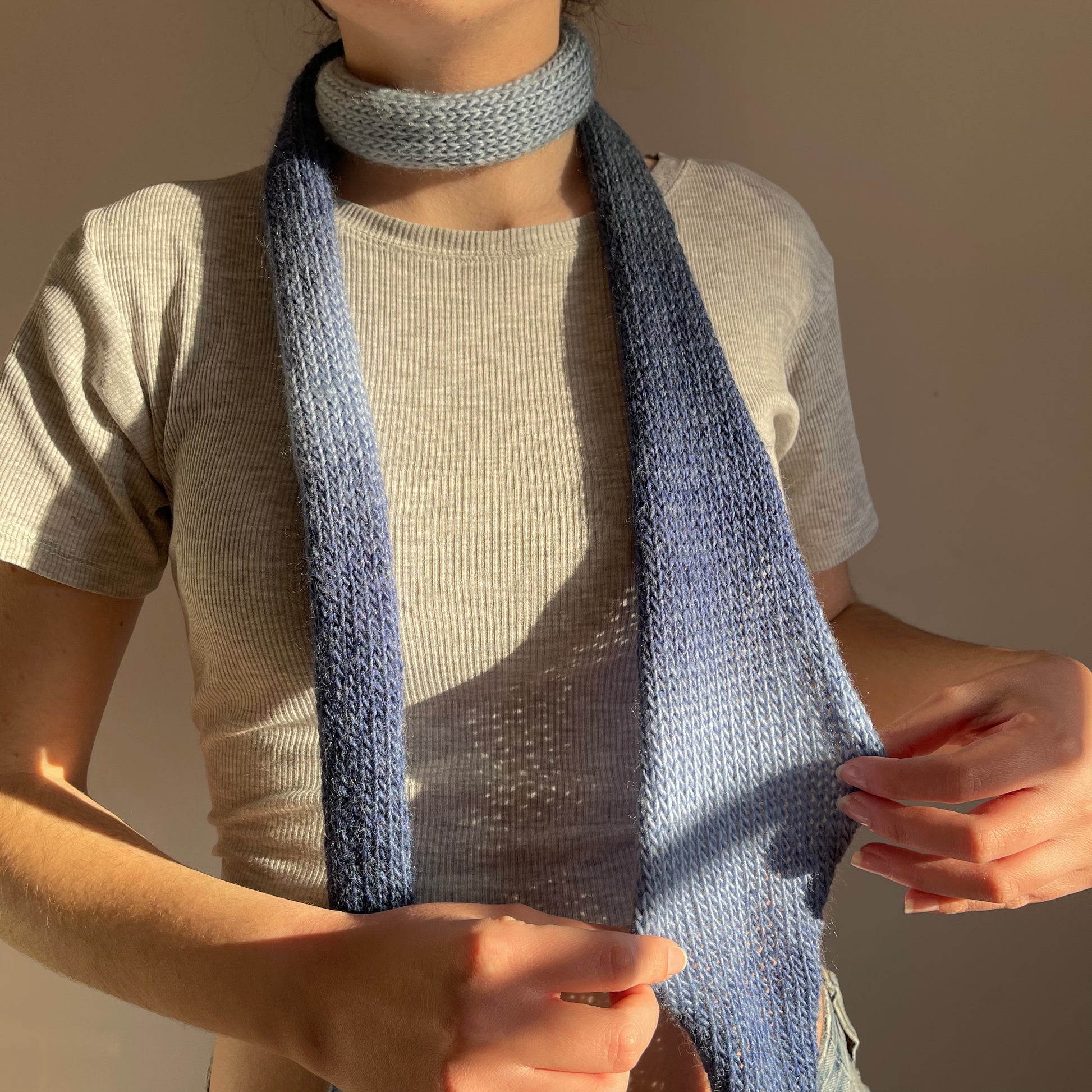 Handmade knitted ombré skinny scarf - blue shades colourway