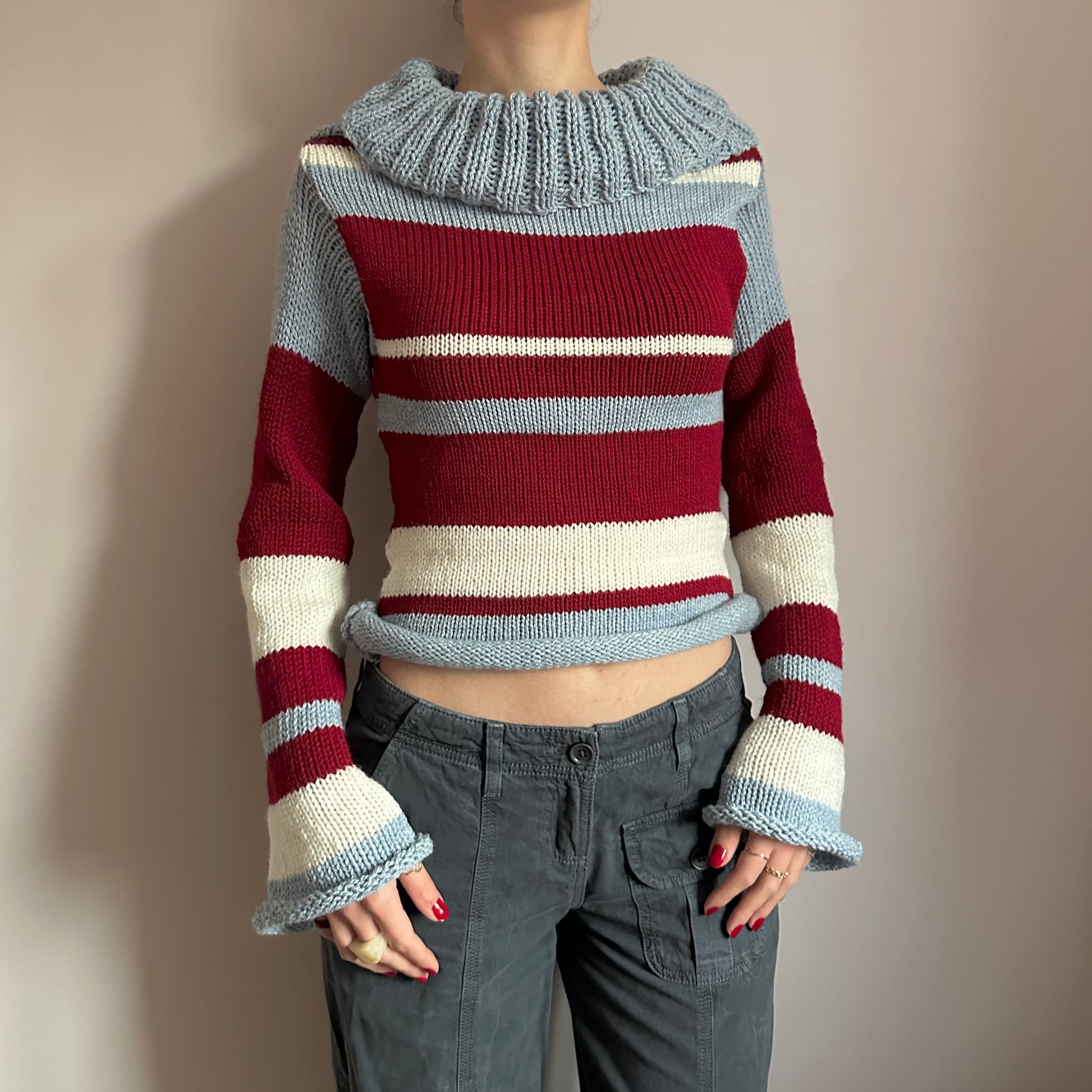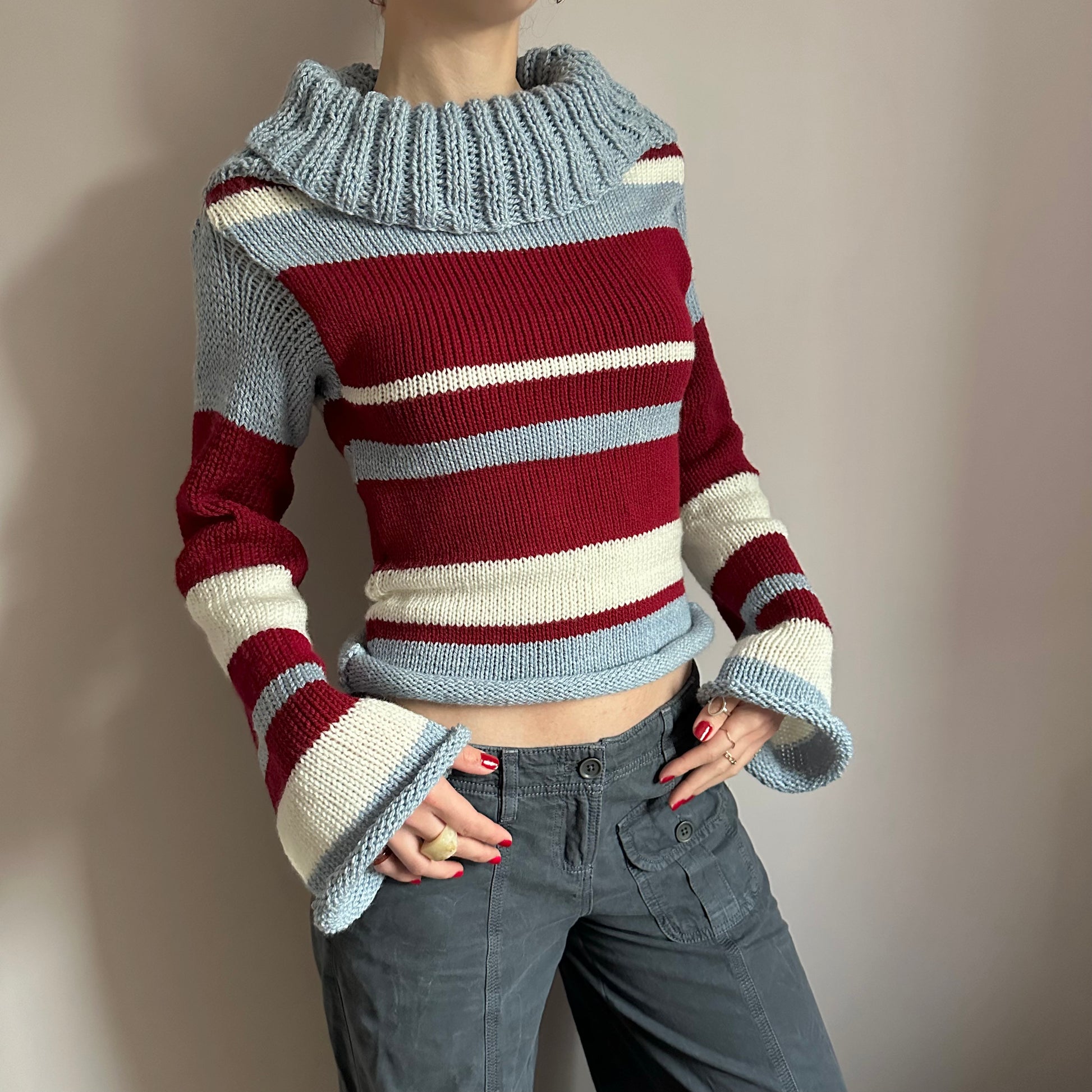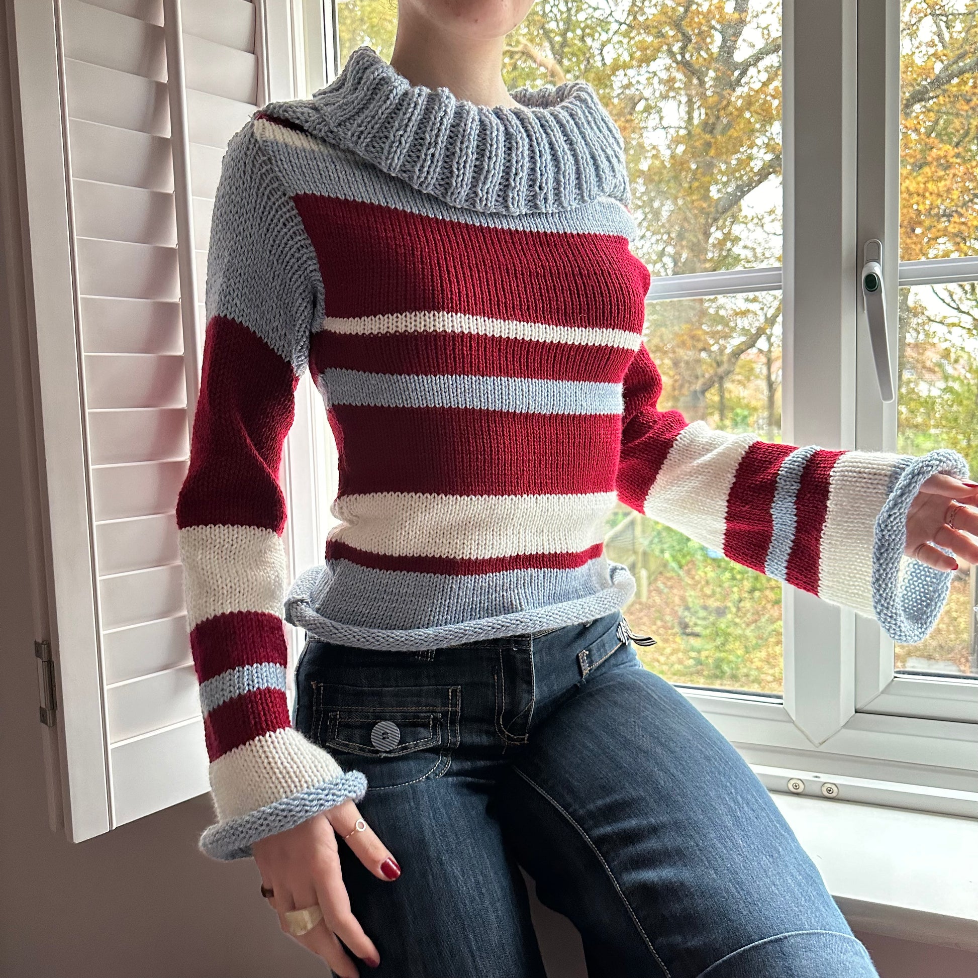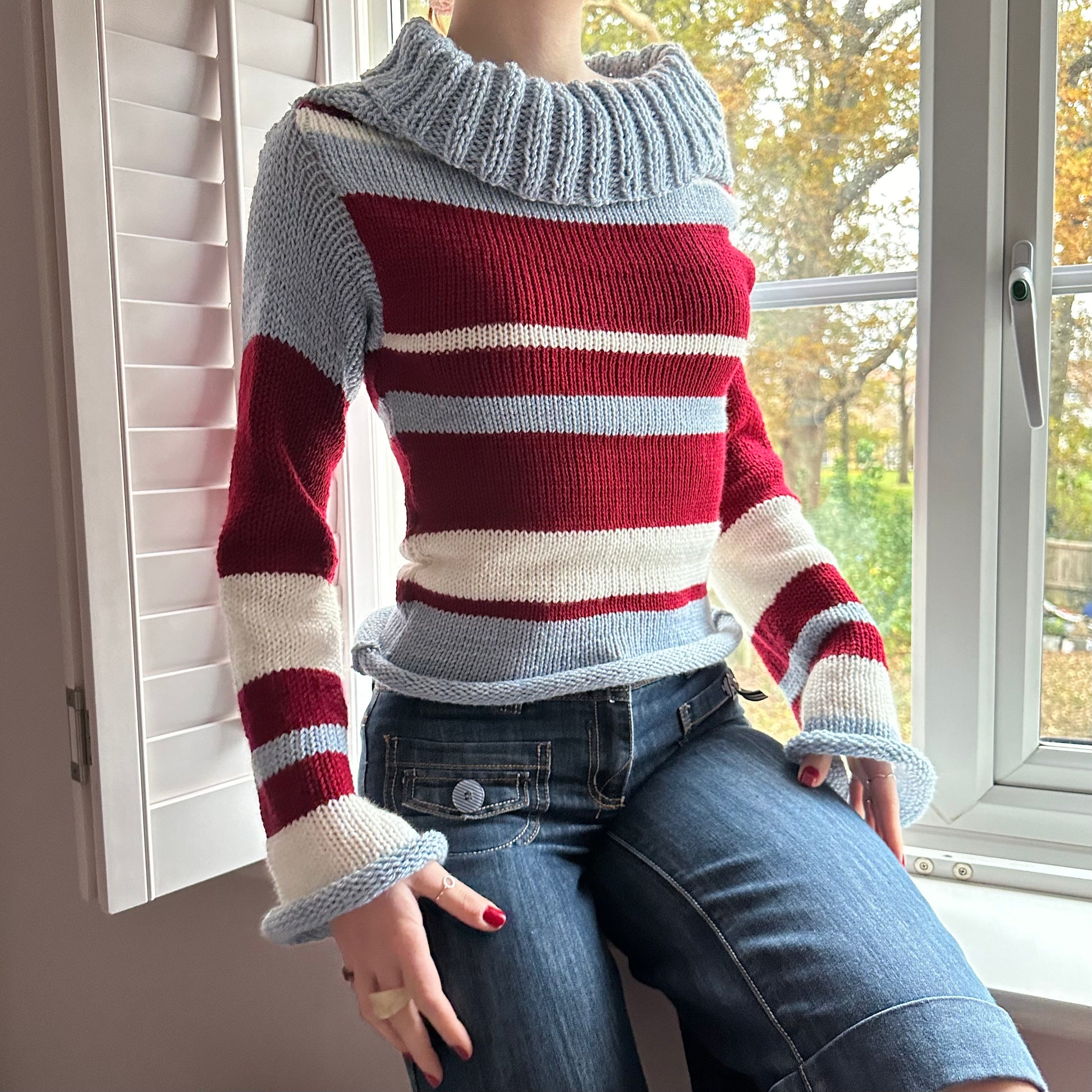 The Raya Jumper: the cutest roll neck stripy knit jumper - the neck can be worn two ways as shown! ๐