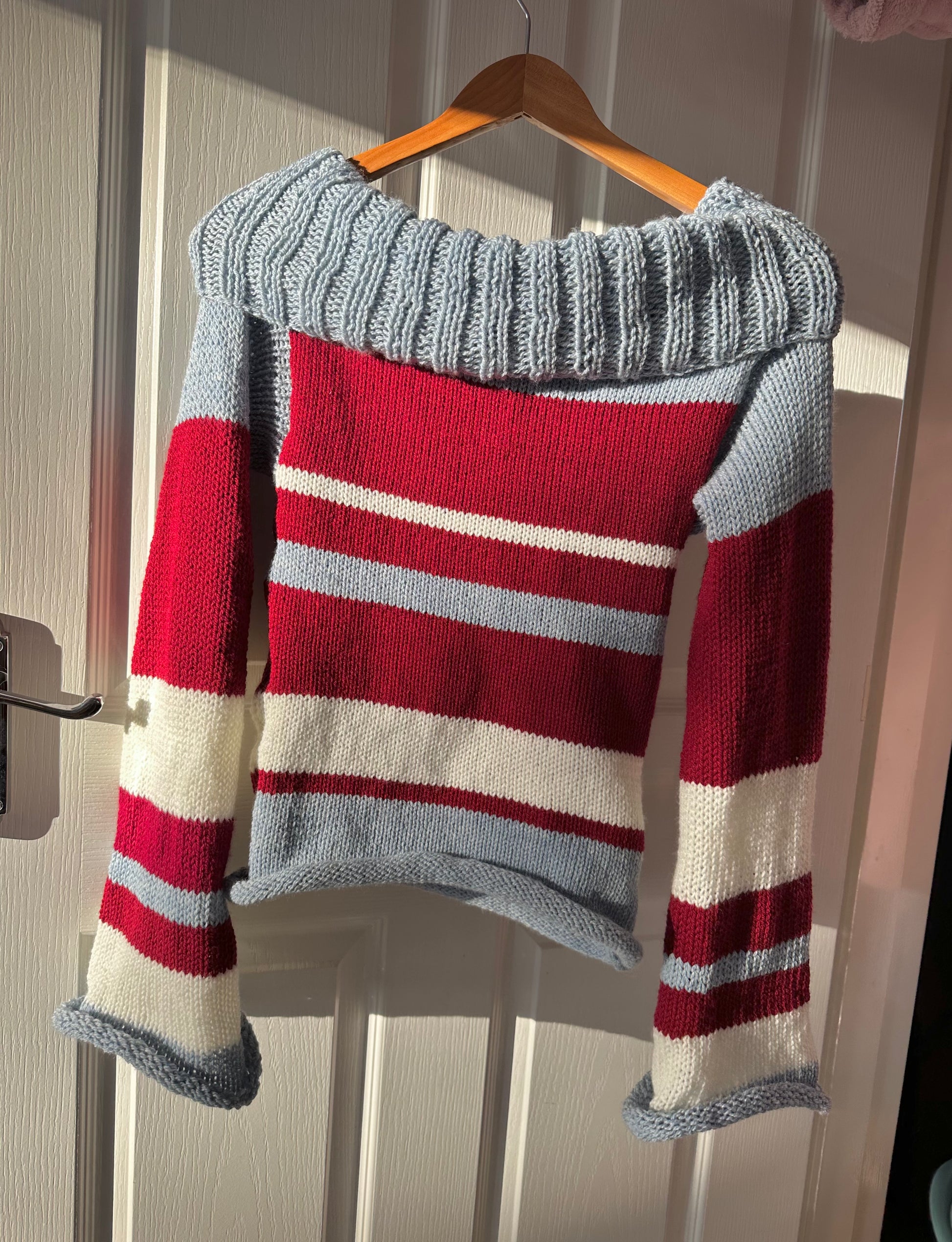 The Raya Jumper - striped cream, red and baby blue roll neck knitted jumper
