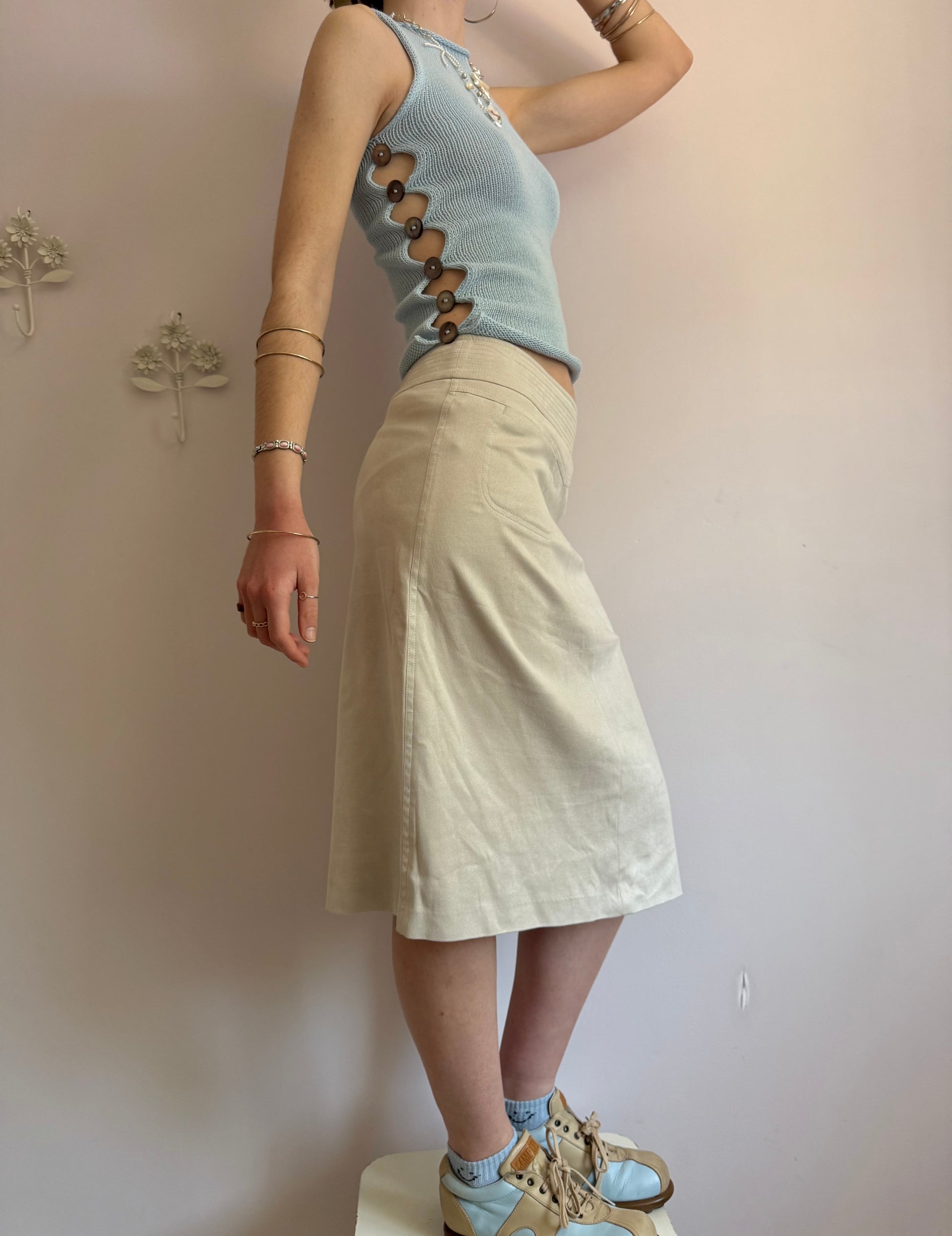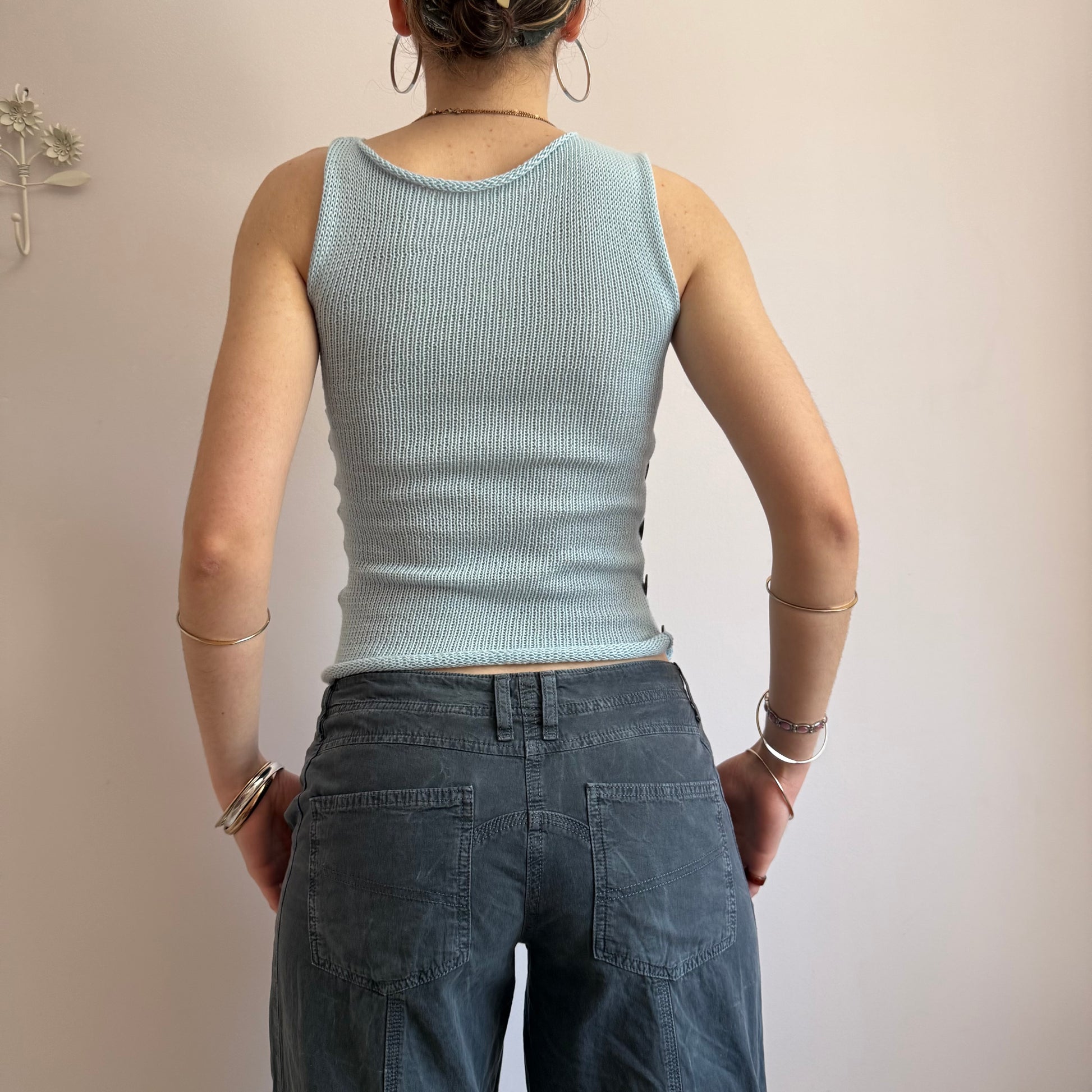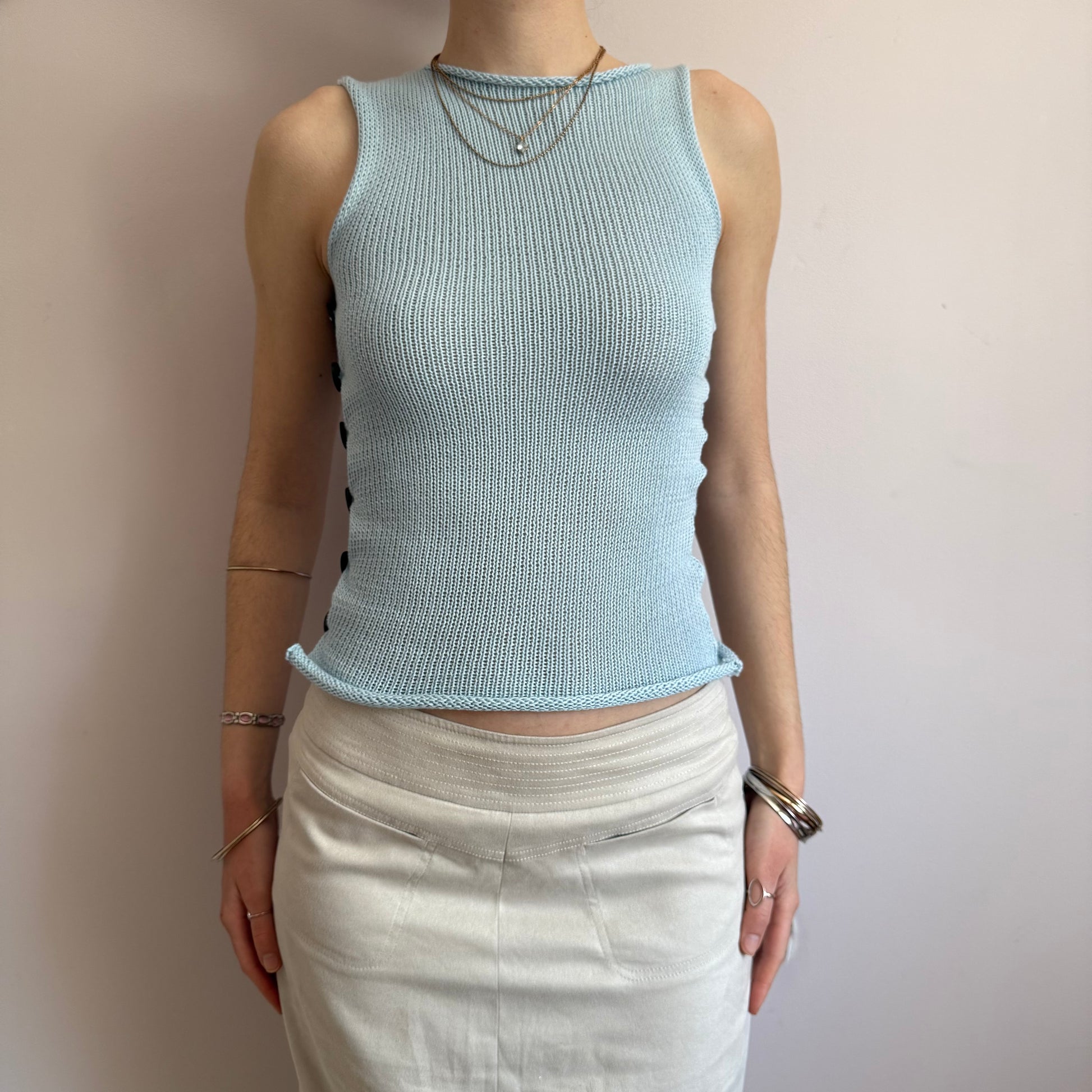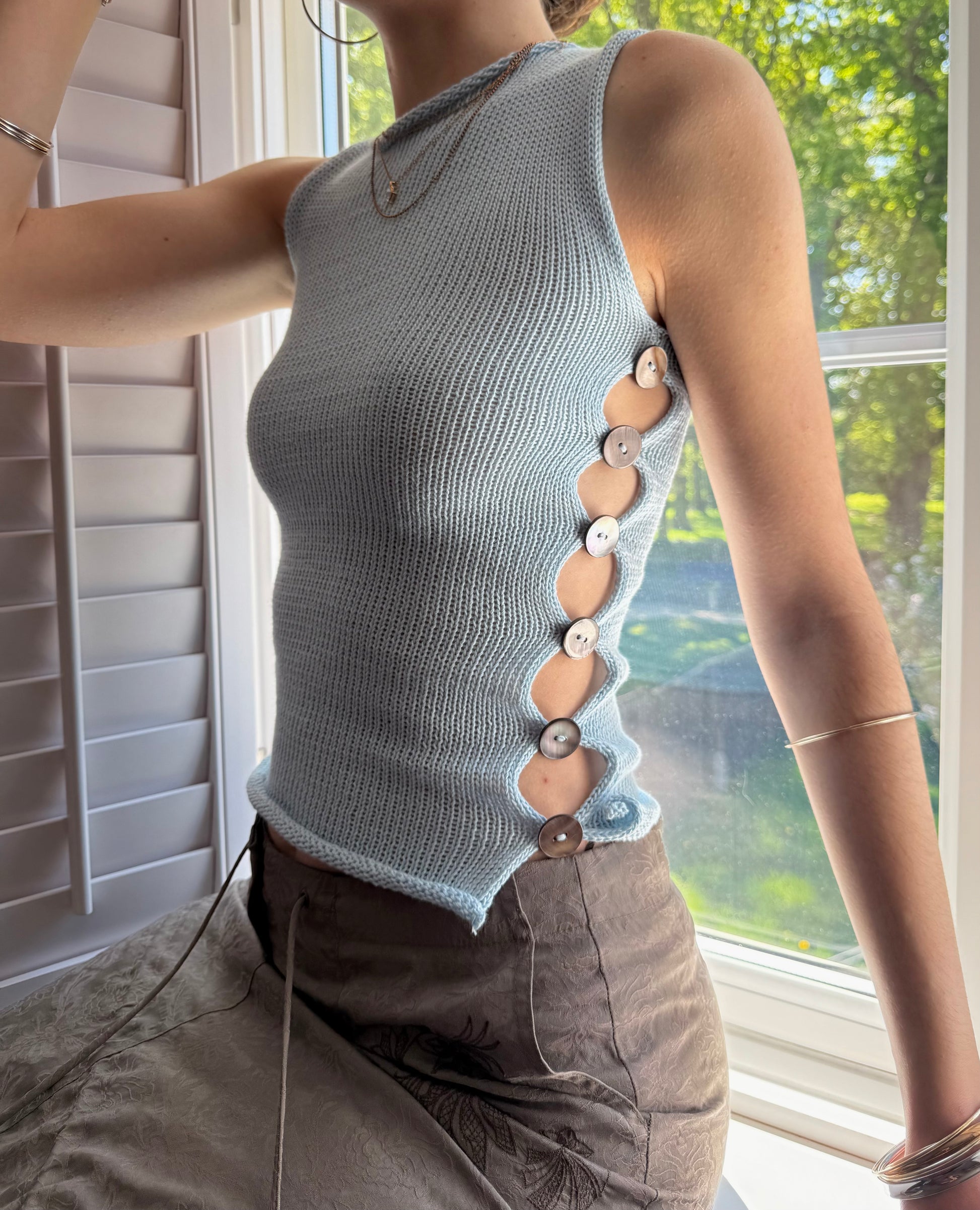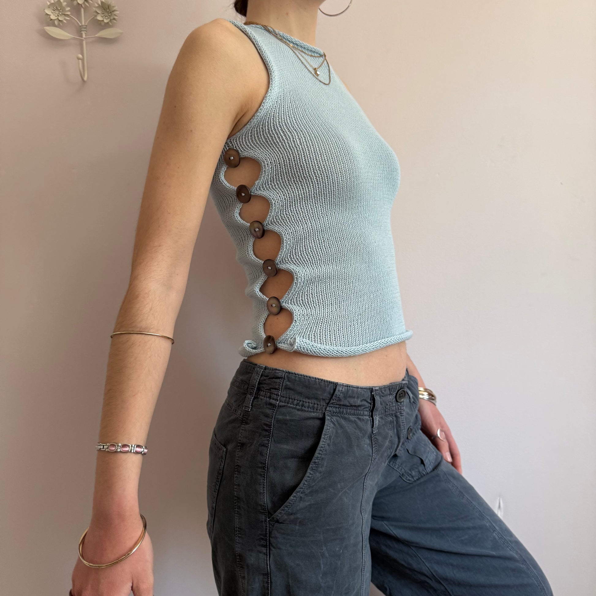Introducing our newest range! 🦋 Handmade knitted cotton tank / vest in baby blue featuring an open side with gorgeous grey iridescent mother of pearl buttons. Such a special piece ✨