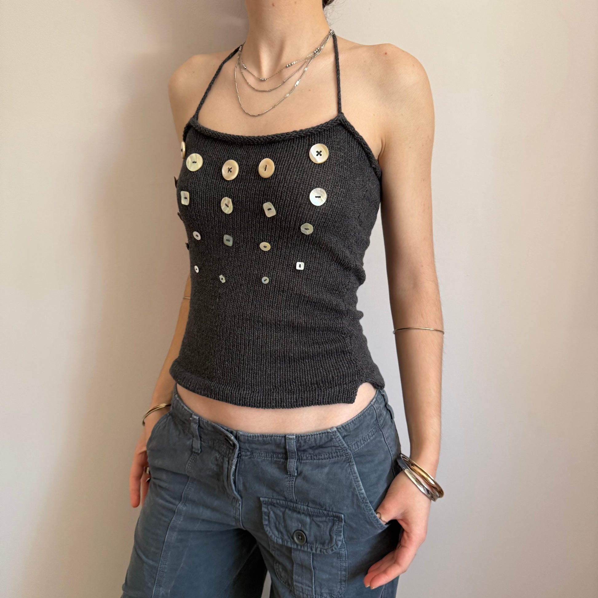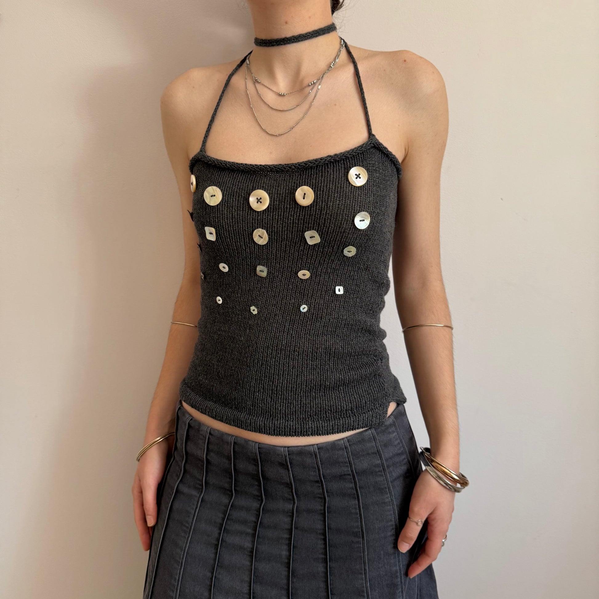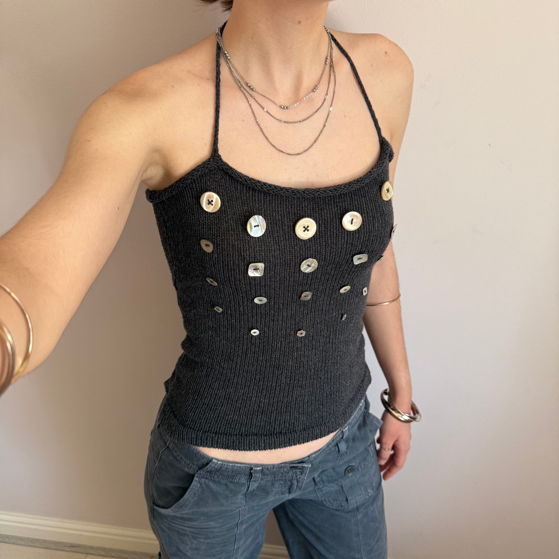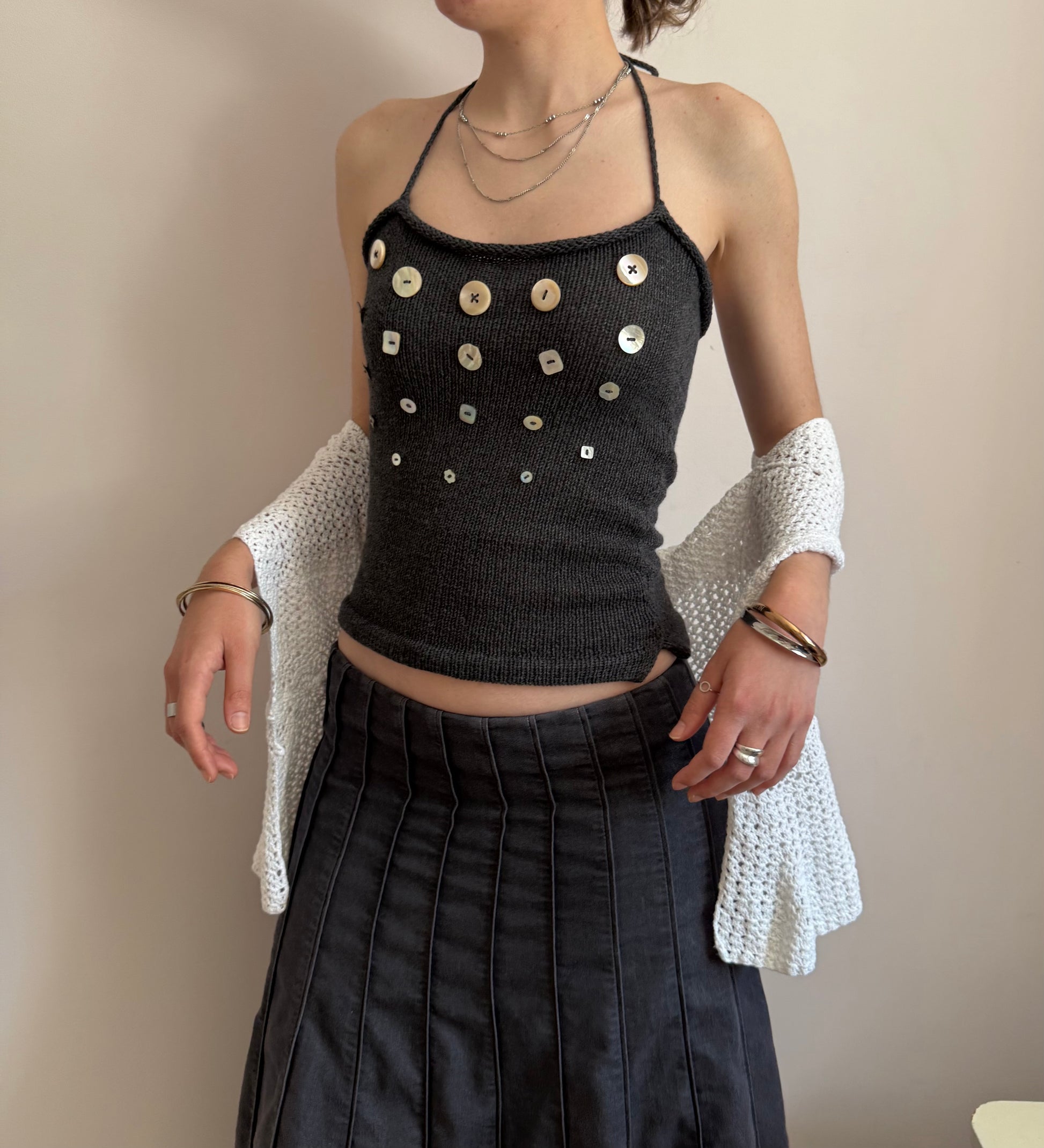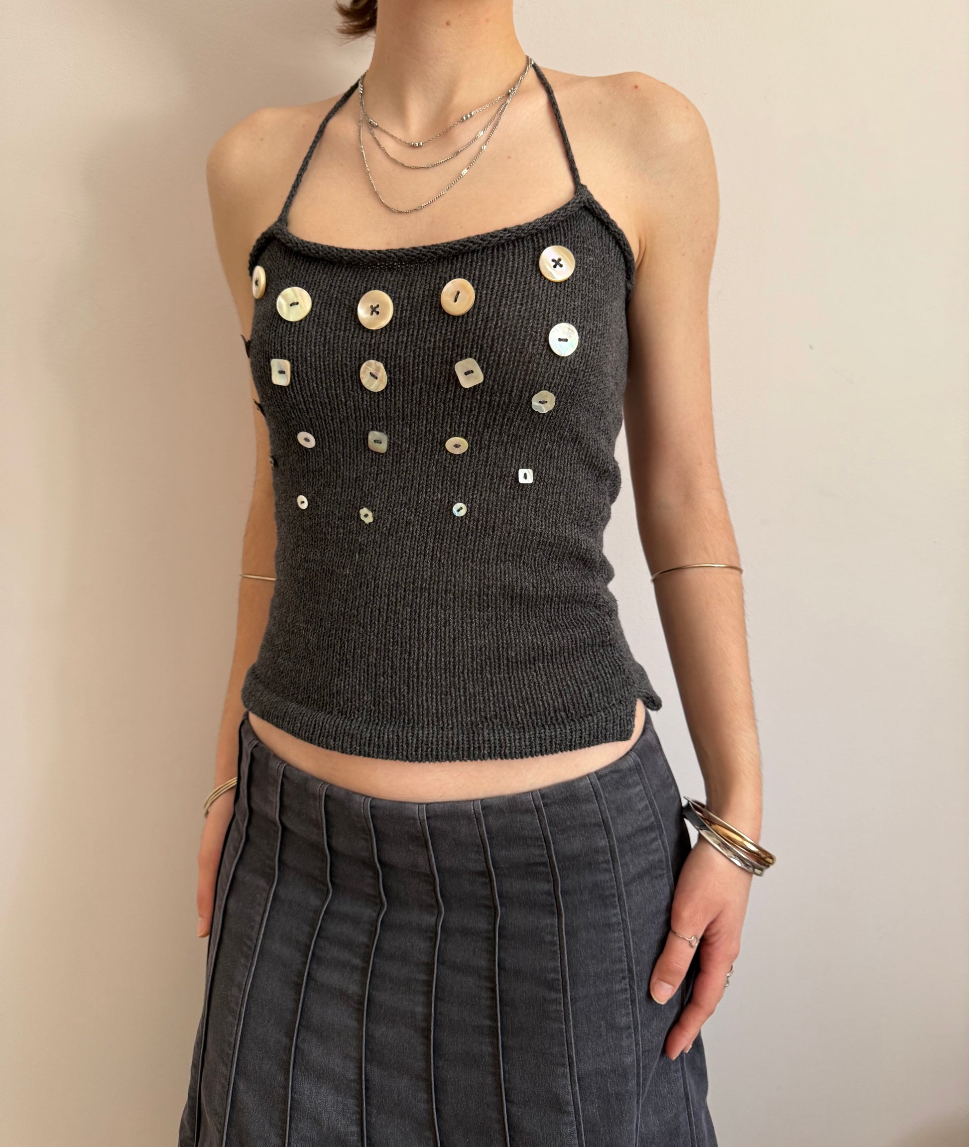 Knitted tank top in charcoal grey adorned with mother of pearl buttons 🦪