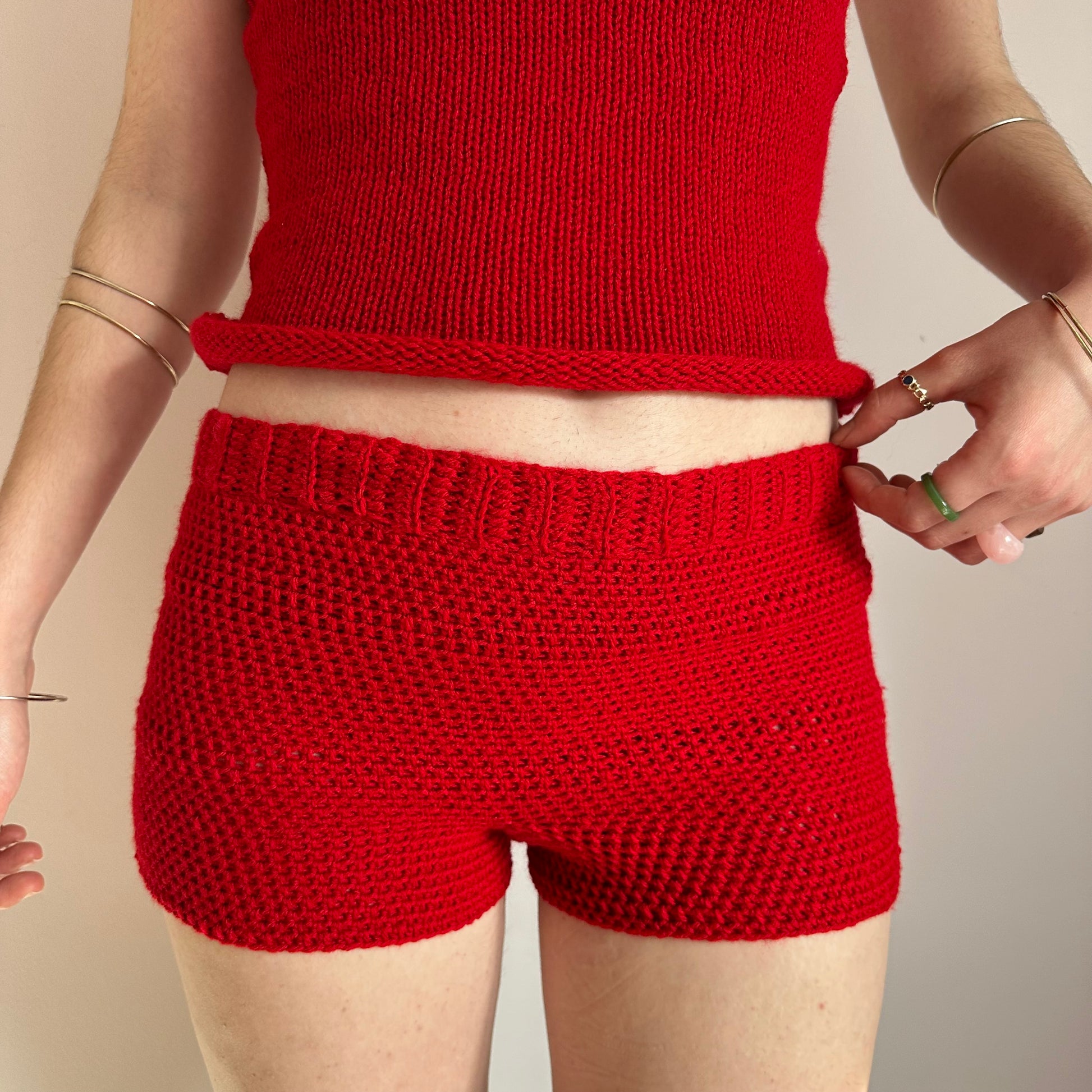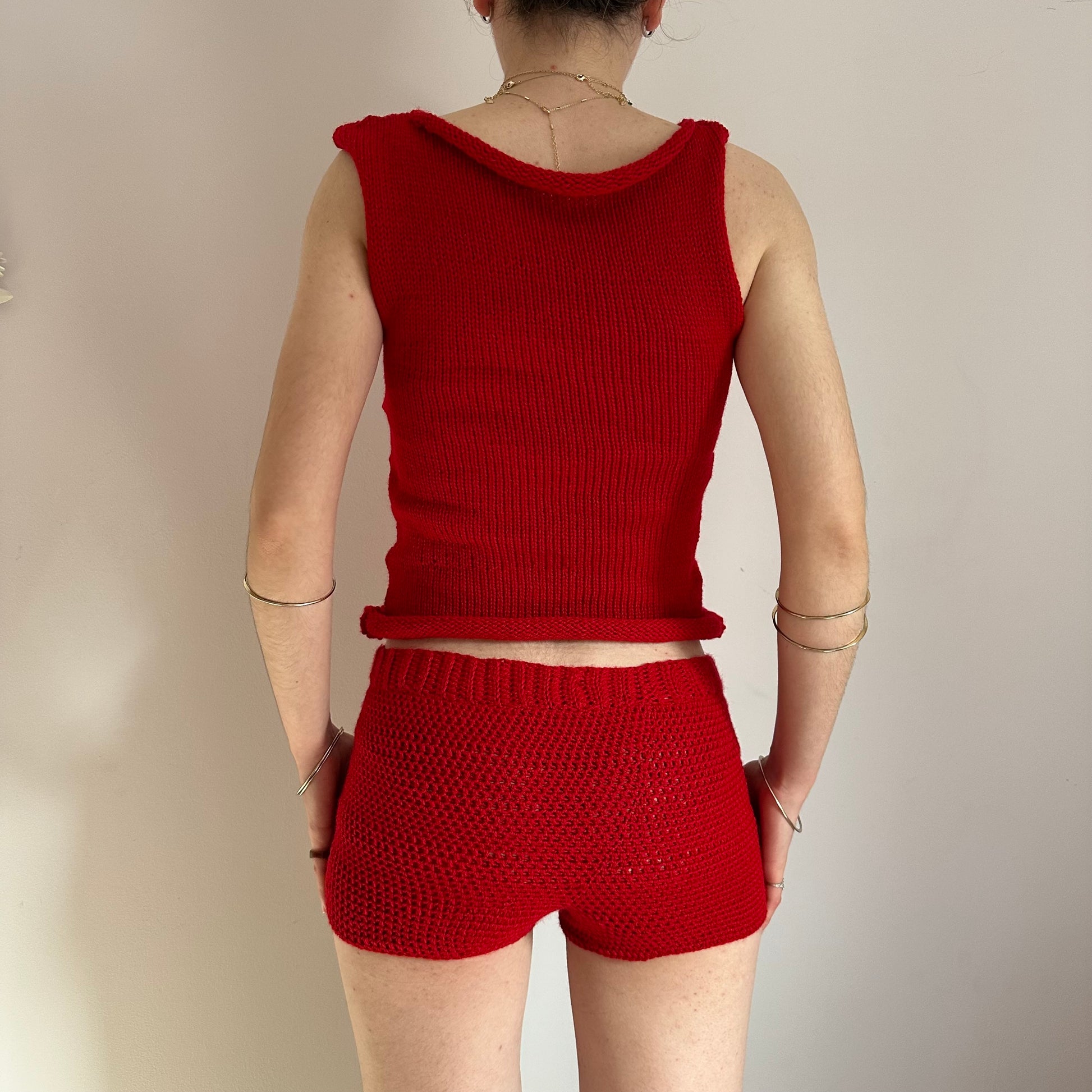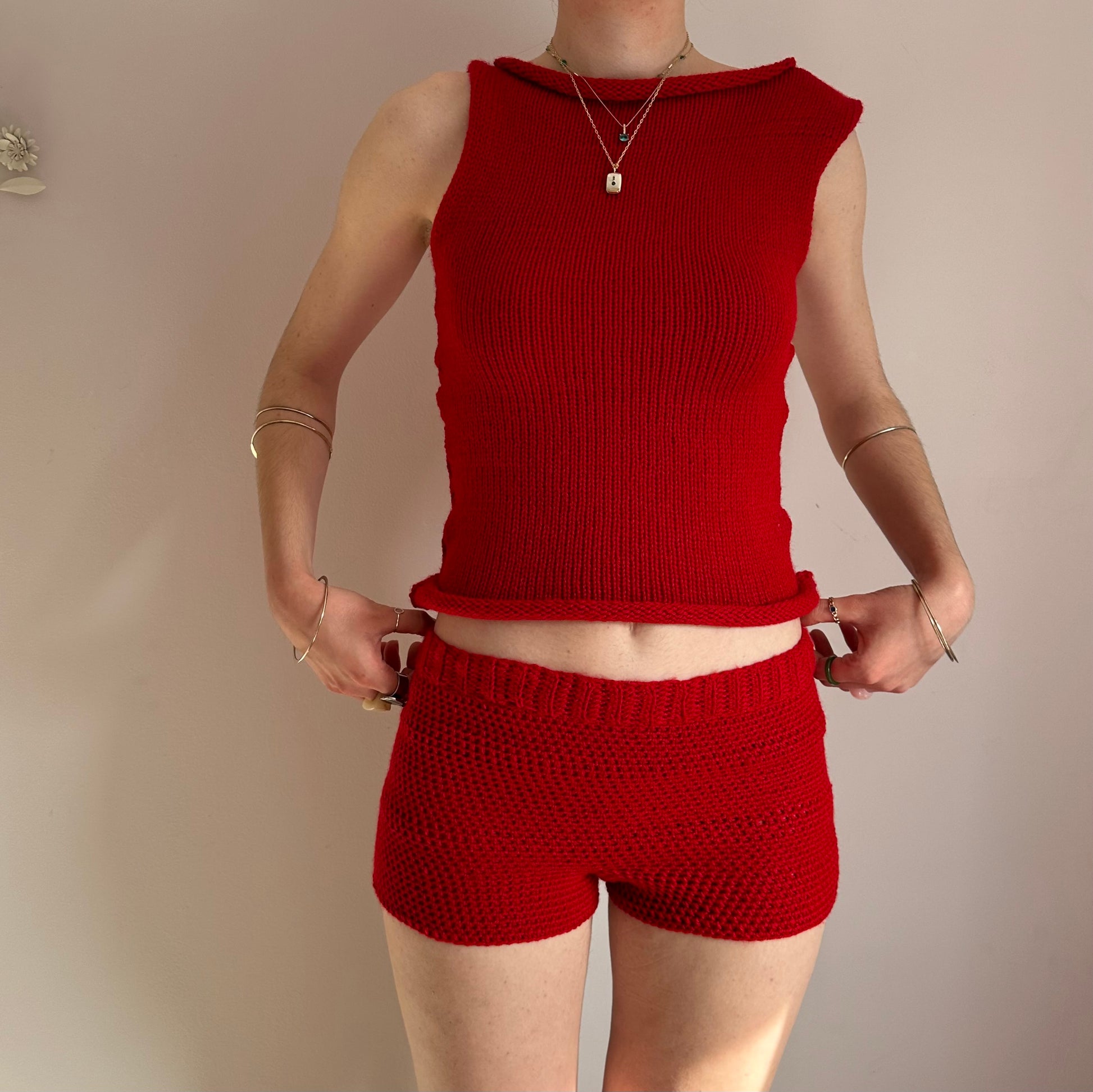 MATCHING SET: Handmade off the shoulder knitted vest and matching red crochet shorts 🍒