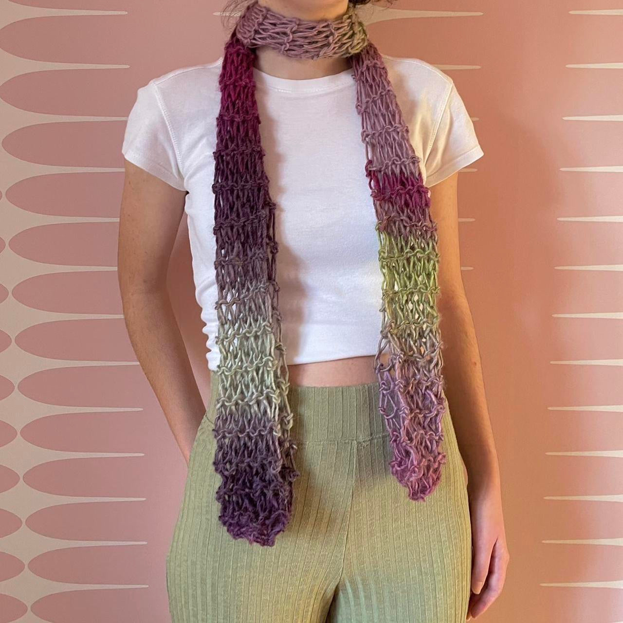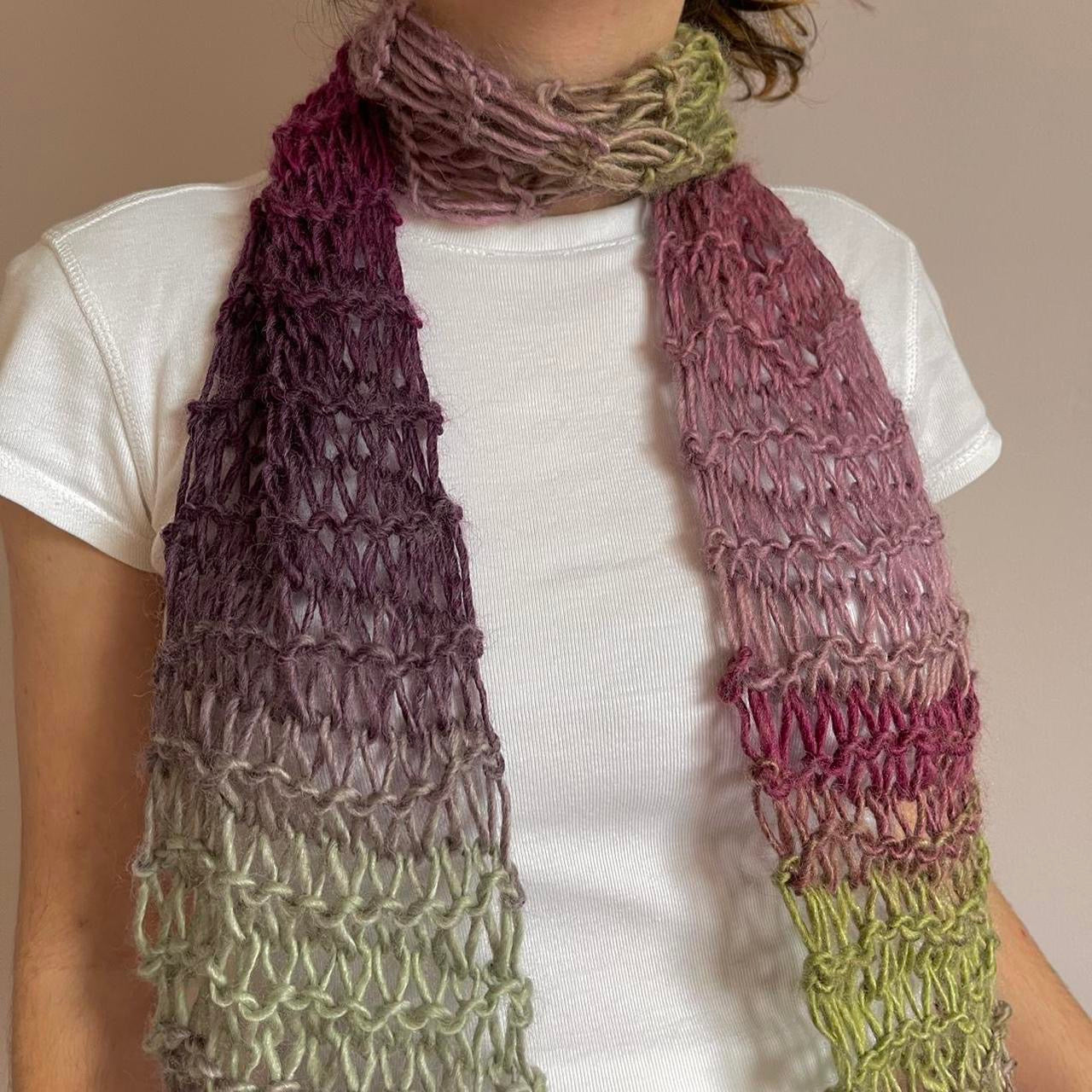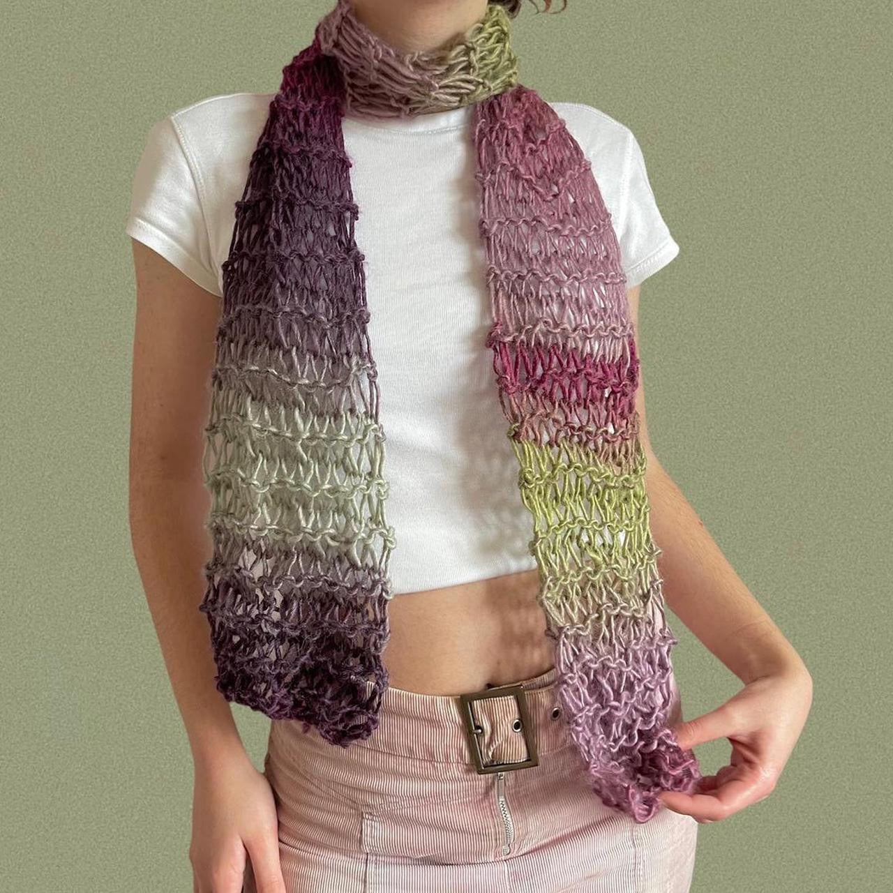 The cutest handmade fishnet / distressed knit scarf in green purple ombré 🔮