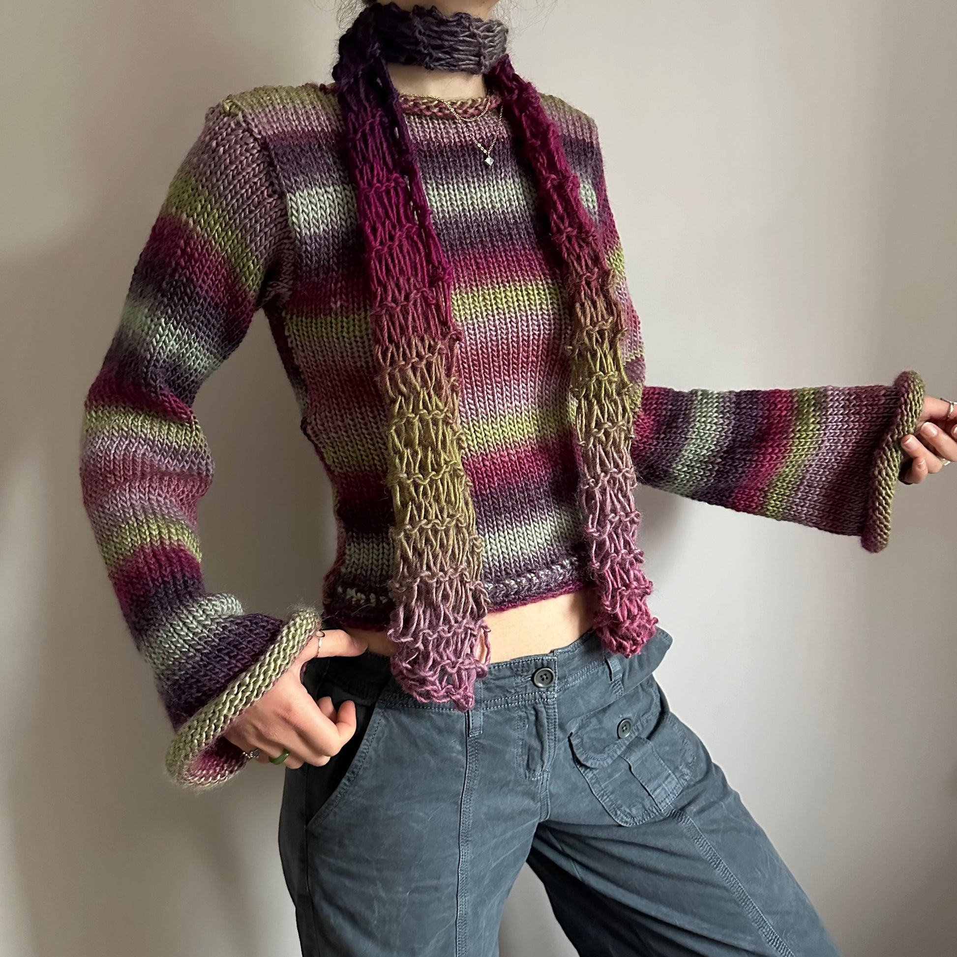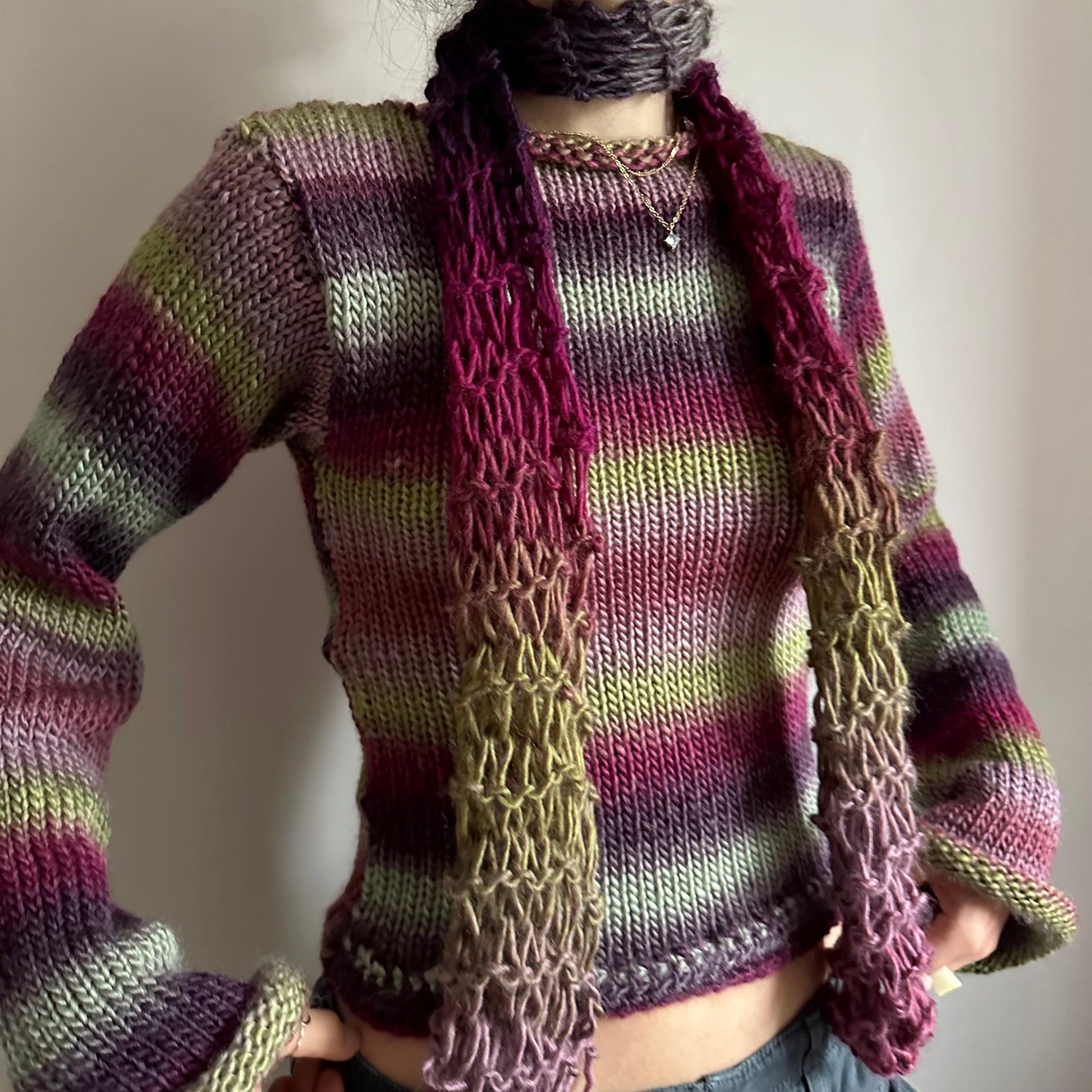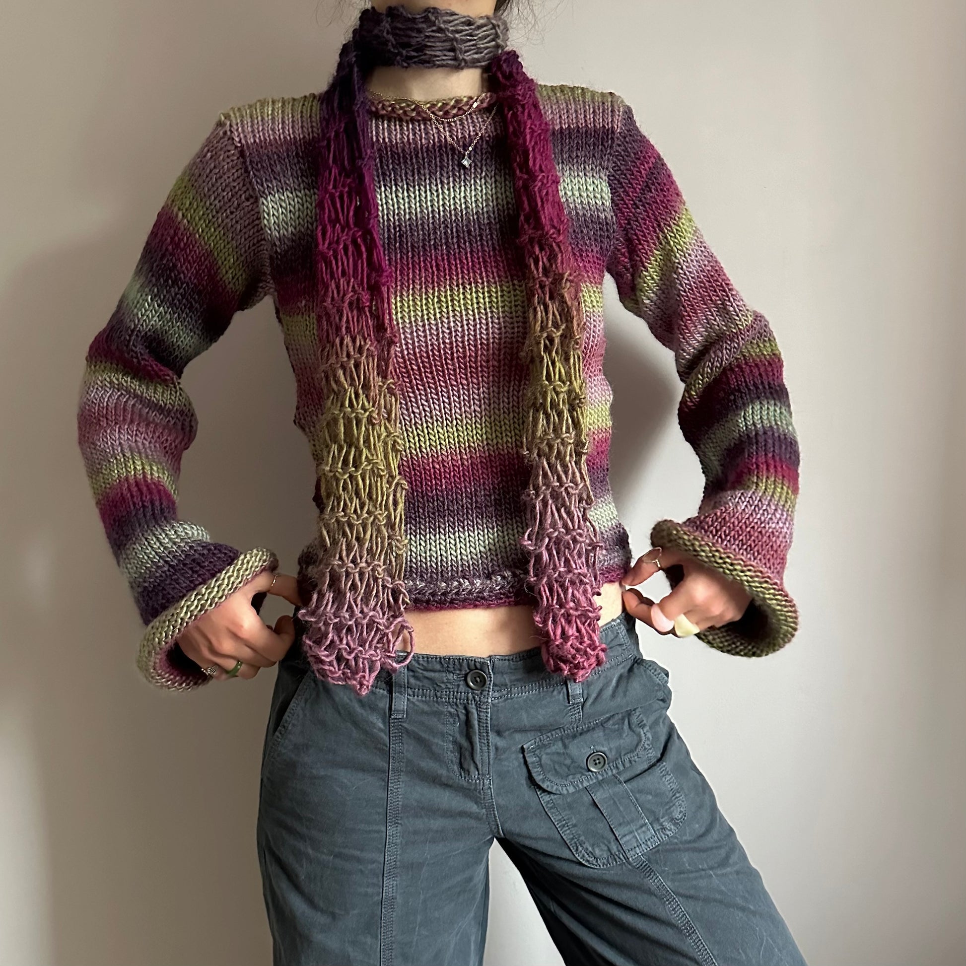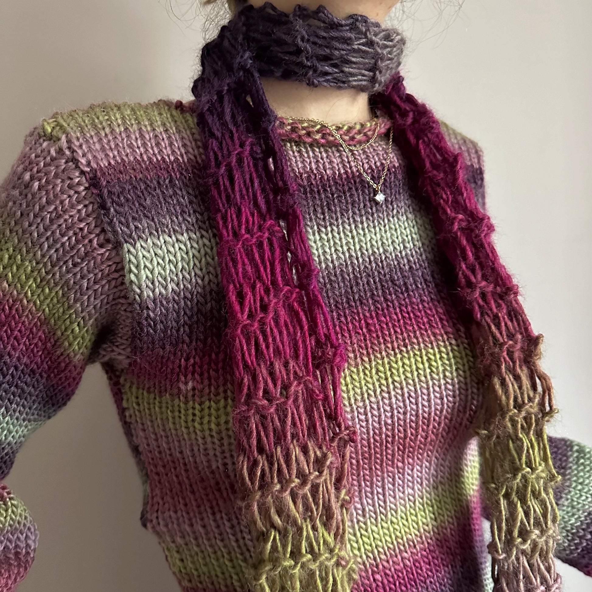 The cutest handmade fishnet / distressed knit scarf in green purple ombré 🔮